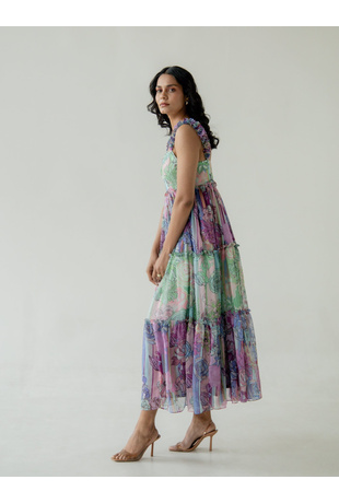 Maxi pullover crew-neck dress with high collar and decorative braids.