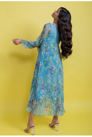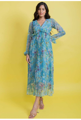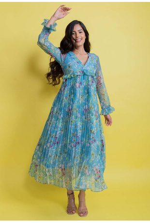 Chiffon Floral Pleated Maxi Dress - Blue