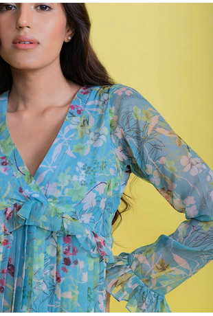 • Overlapping V-neckline and long sleeves with ruffles
