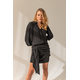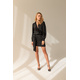 Charlotte black dress is a stylish cocktail dress. The dress has a loose cut, shirt-like top buttoned with a concealed placket, sleeve with a slight buffet with a two-button cuff. The bottom of the dress is slightly before the knee with a tied longer sash. The dress is zippered at the side, and has an invisible elastic at the back waist for a snug fit at the waist and hips. The dress is made of matte viscose in classic black. The bottom of the dress is lined, fabric-coated buttons.