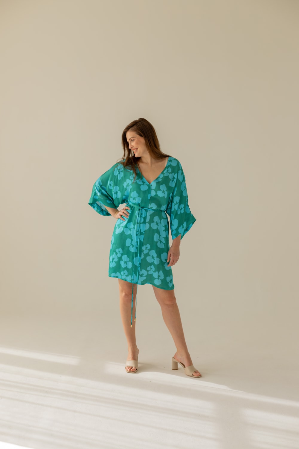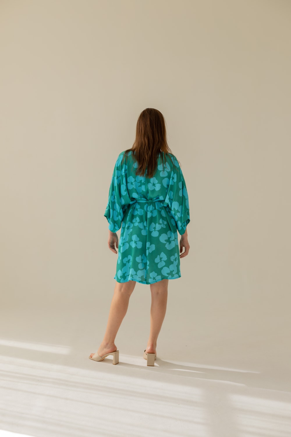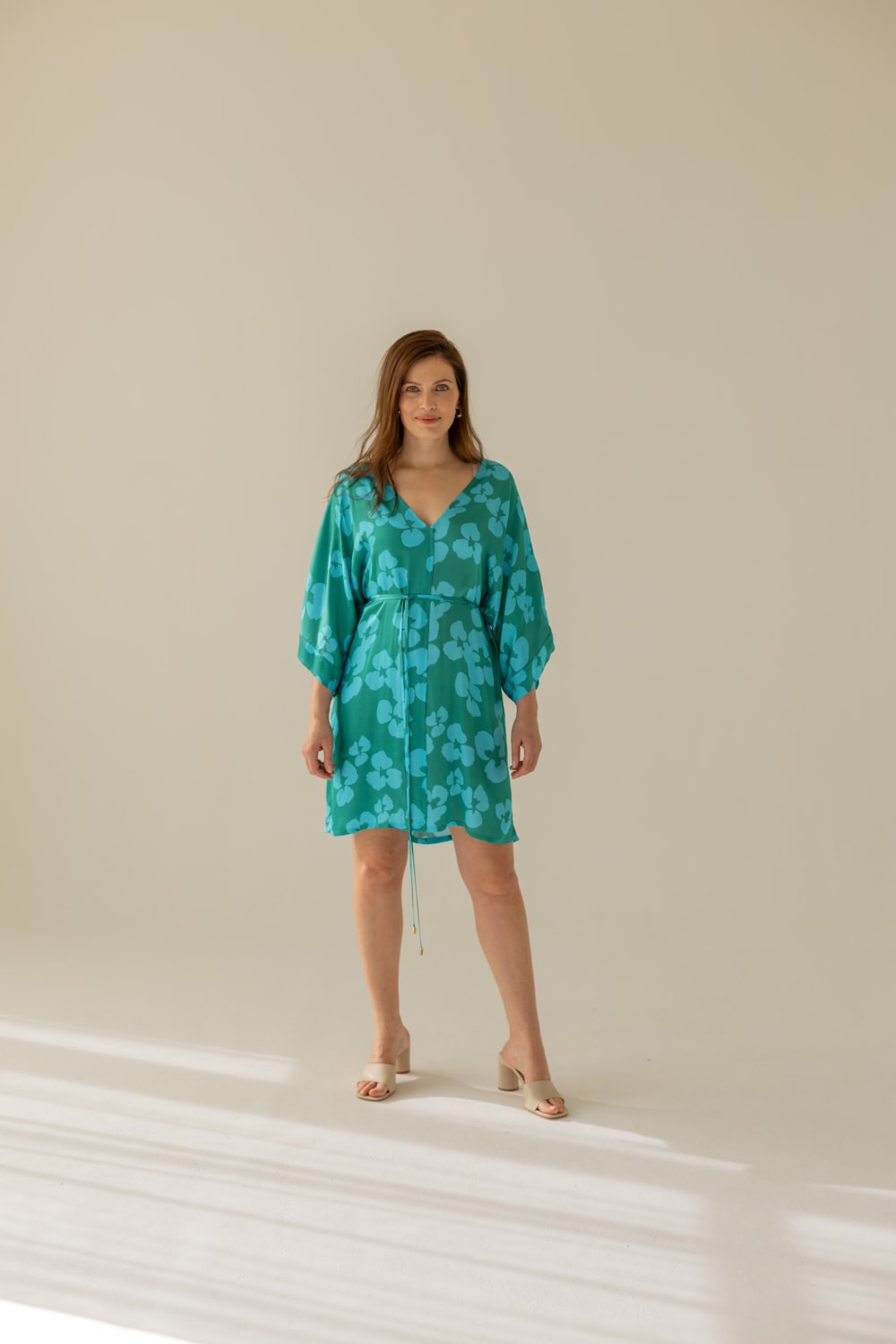 The Thilde emerald flower dress is a kimono dress, a shorter version of our maxi dress. The dress has a loose, yet feminine cut highlighted by a neckline and mini slits on the sides. 3/4 length kimono sleeves, in addition to the dress there is a very thin belt with gold decorative elements, it can be tied twice around the waist.