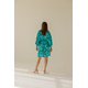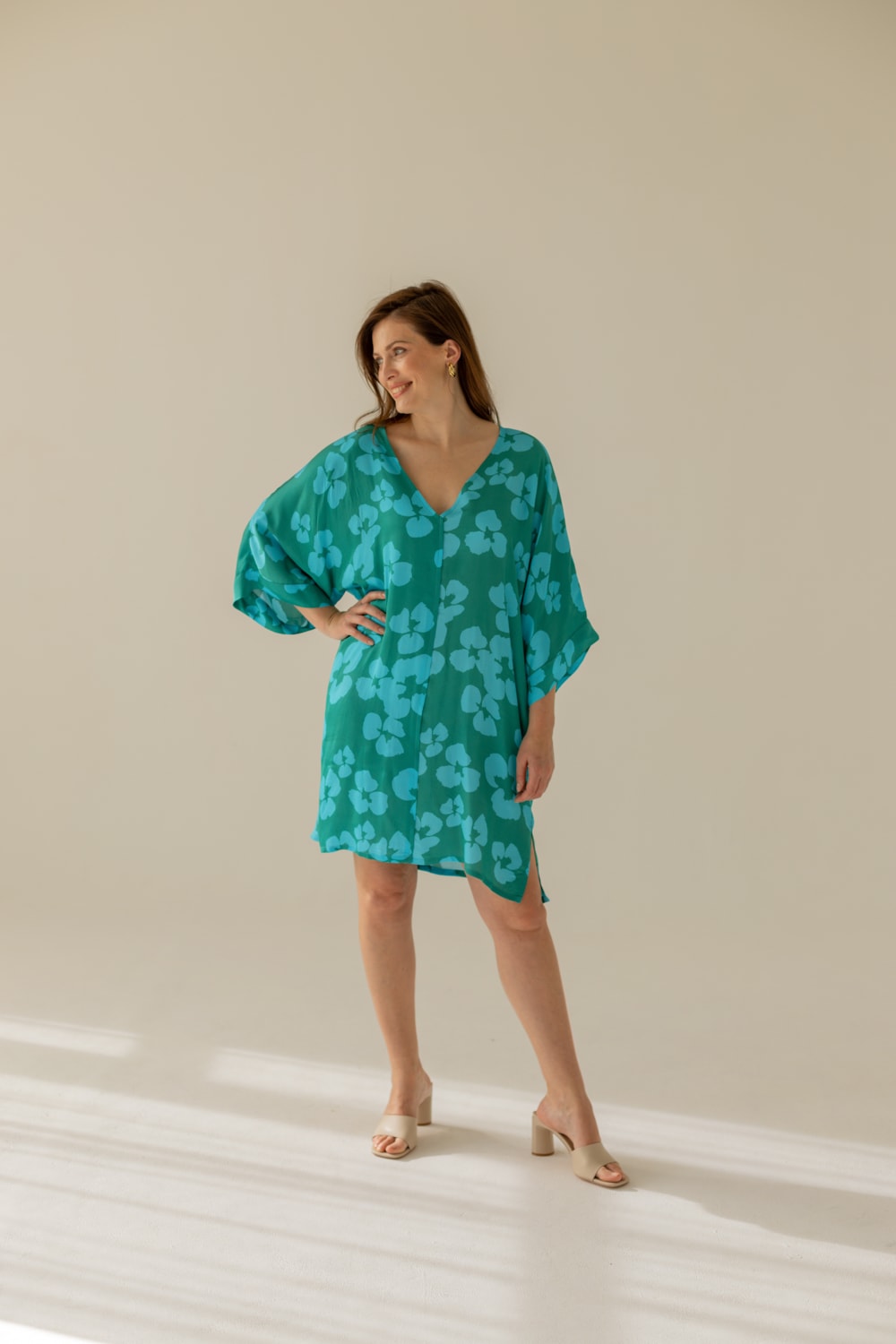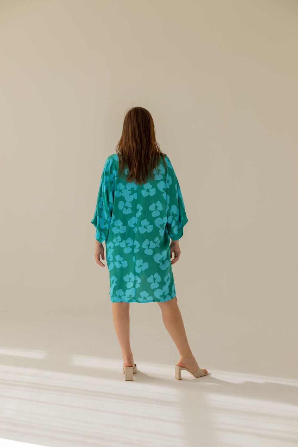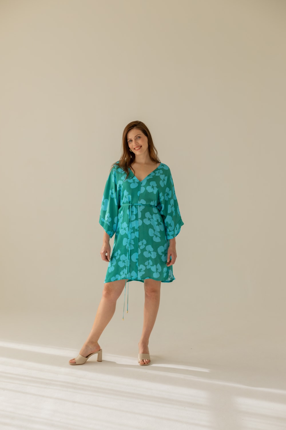 The Thilde emerald flower dress is a kimono dress, a shorter version of our maxi dress. The dress has a loose, yet feminine cut highlighted by a neckline and mini slits on the sides. 3/4 length kimono sleeves, in addition to the dress there is a very thin belt with gold decorative elements, it can be tied twice around the waist.