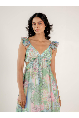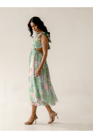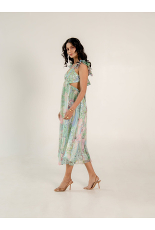 • A long dress with V-neck, ruffle strap and a cut-out detail on the waist.