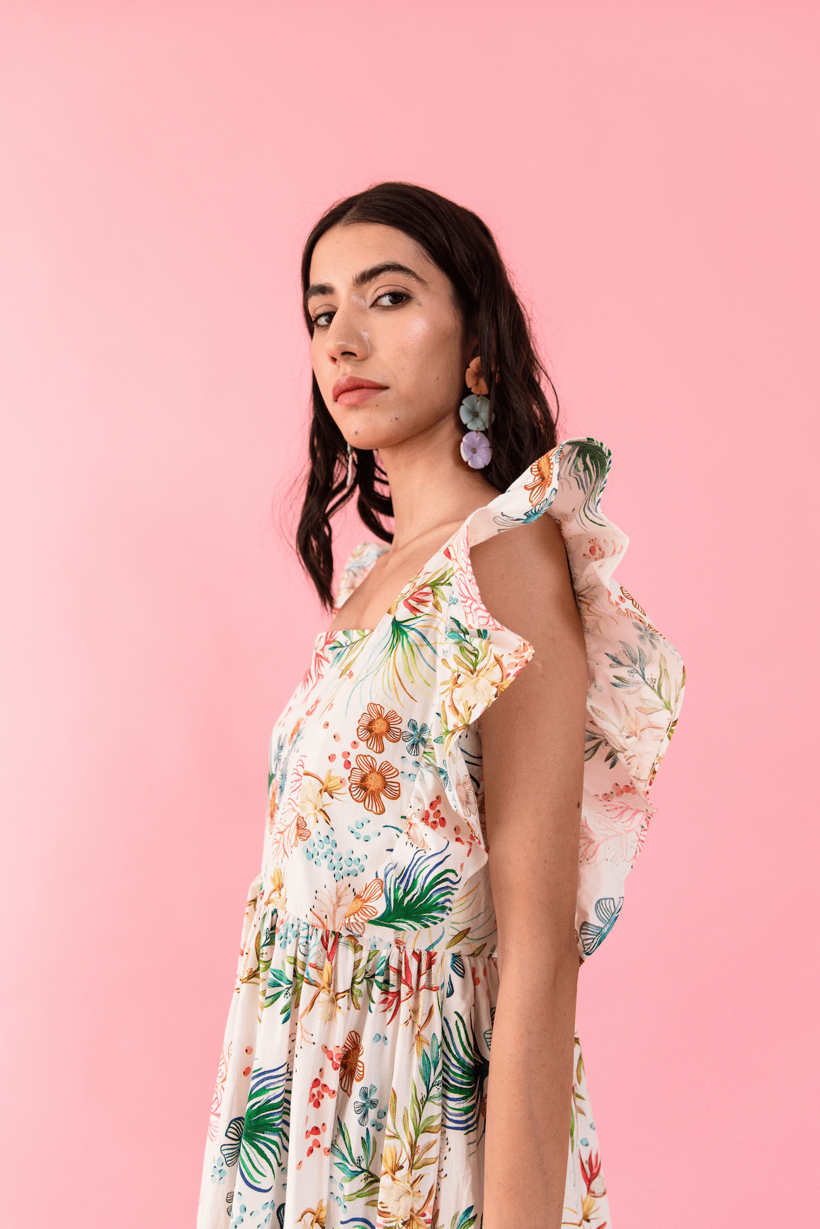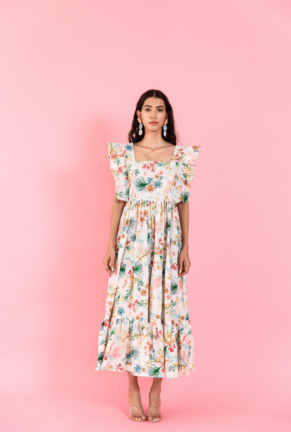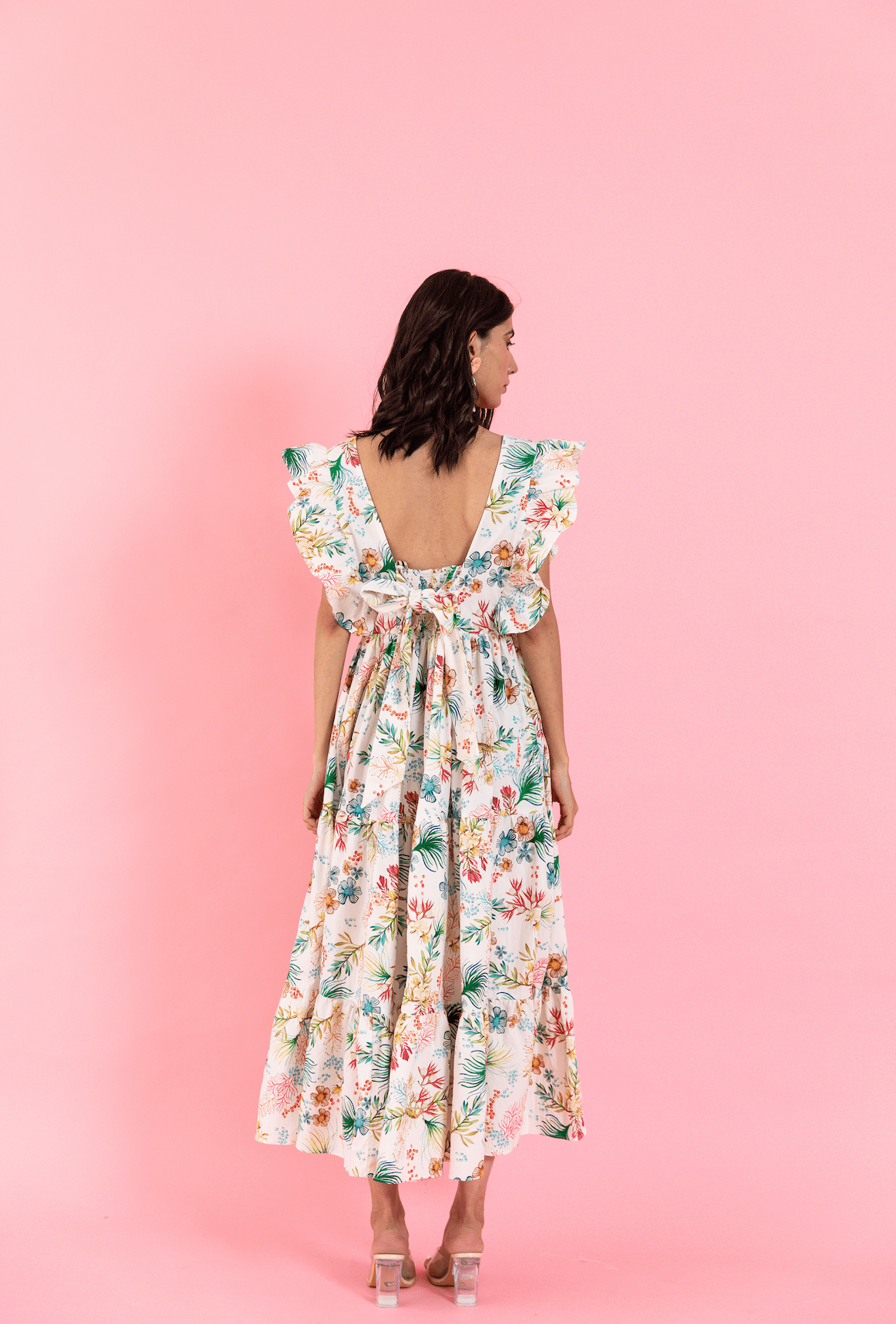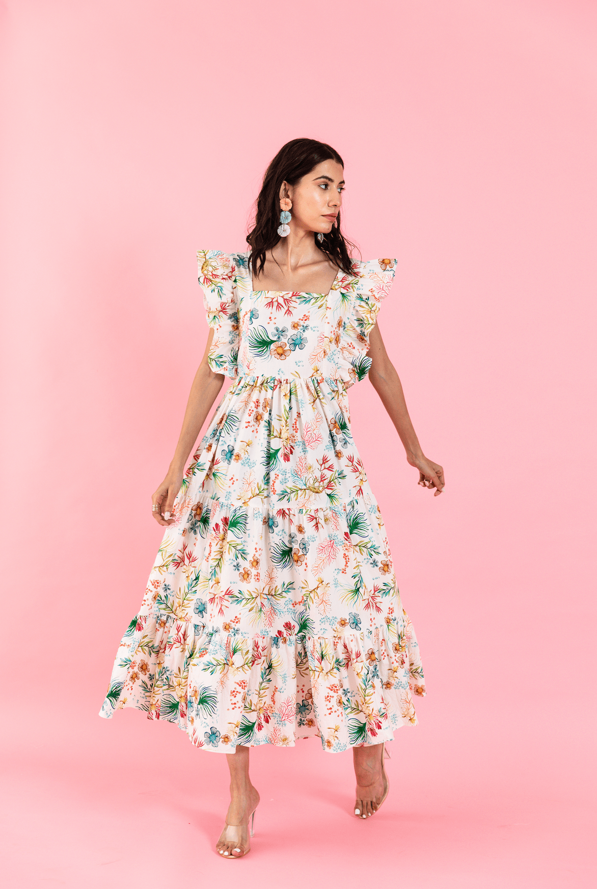 Square neck, tiered dress, easy going flare with smocked panel with tie up back detail and ruffle shoulder, handcrafted in our yarrow print in sustainable organic cotton fabric.