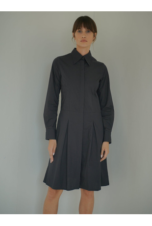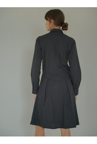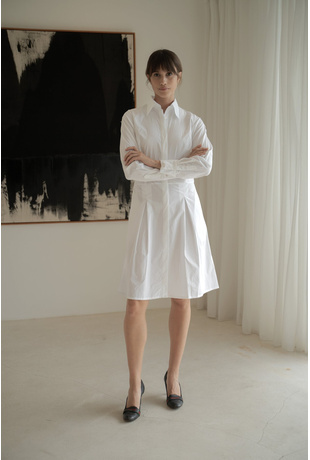 Our lightweight custom organic cotton poplin shirt dress features seaming details through the waist for a fresh, architectural and flattering silhouette. The classic straight sleeves are finished with a clean, classic cuff.
