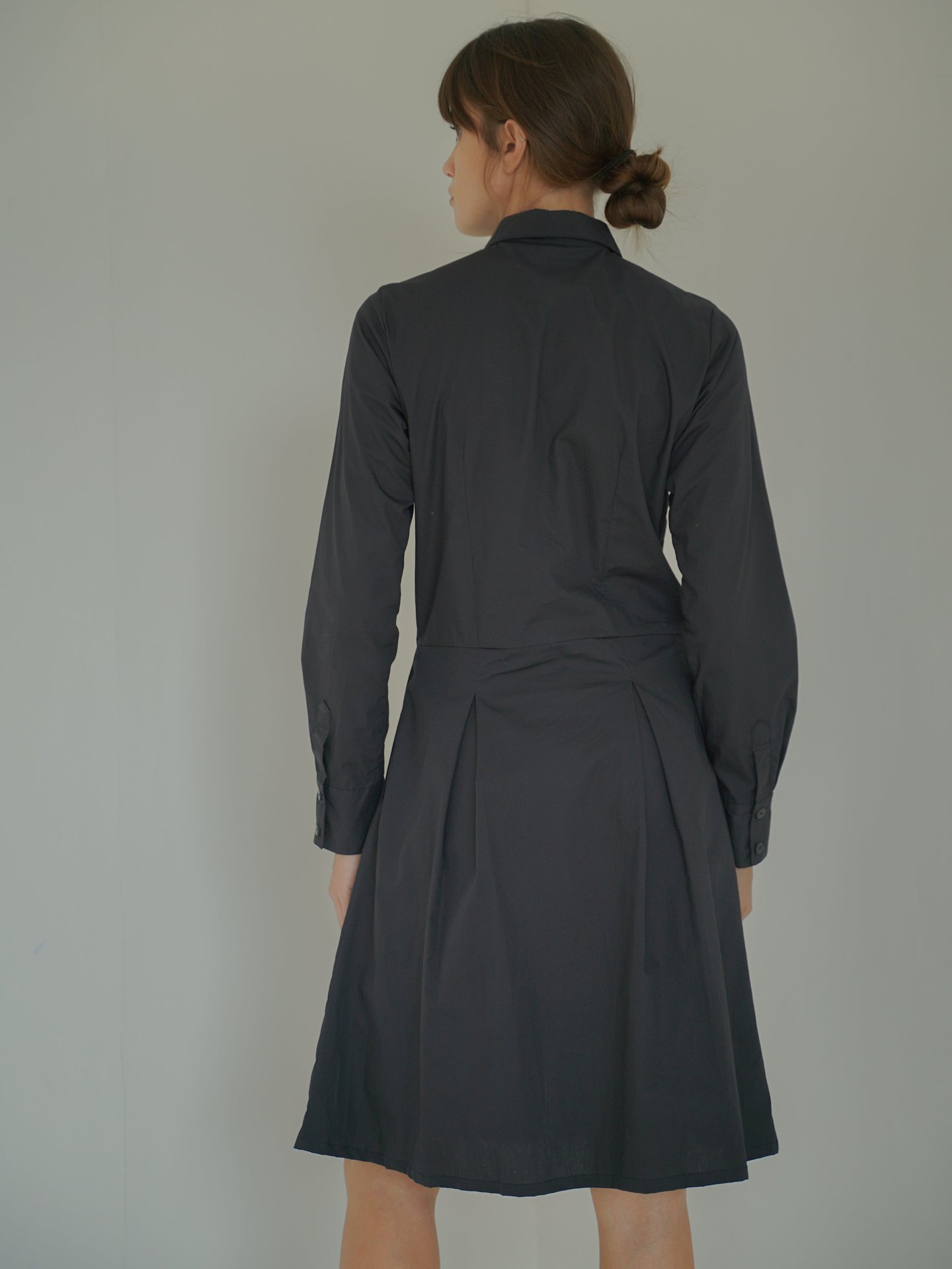 Our lightweight custom organic cotton poplin shirt dress features seaming details through the waist for a fresh, architectural and flattering silhouette. The classic straight sleeves are finished with a clean, classic cuff.