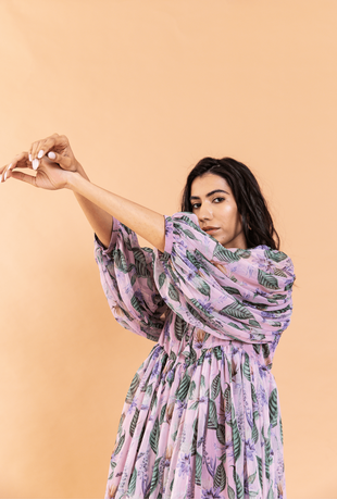 Round neck with front tie up, easy going flare short dress with balloon sleeves, handcrafted in our aster print in sustainable chiffon fabric.