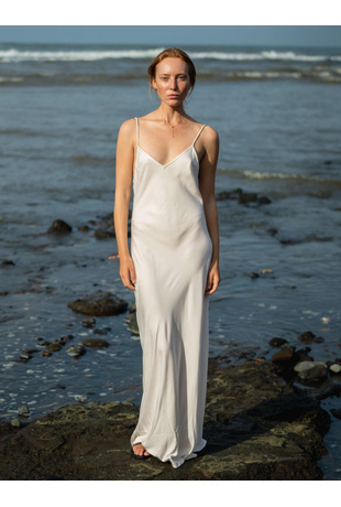 Our summer Seamed Slip Dress has been crafted from bamboo fabric with satin finish. Boasting a V front, low tie-back detail with adjustable drawstring straps. A minimalist design made to travel from beach to evening, alone or layered.
