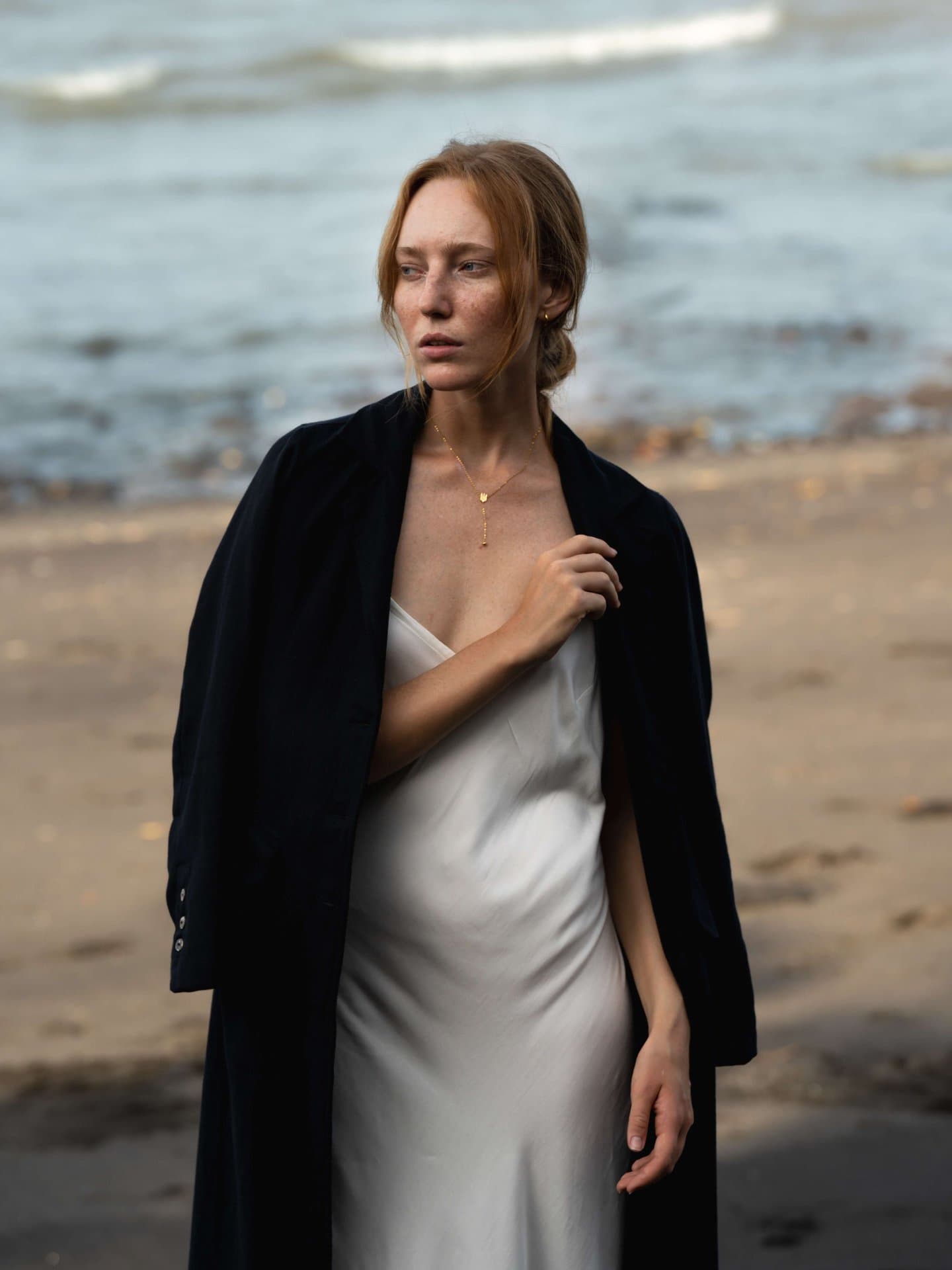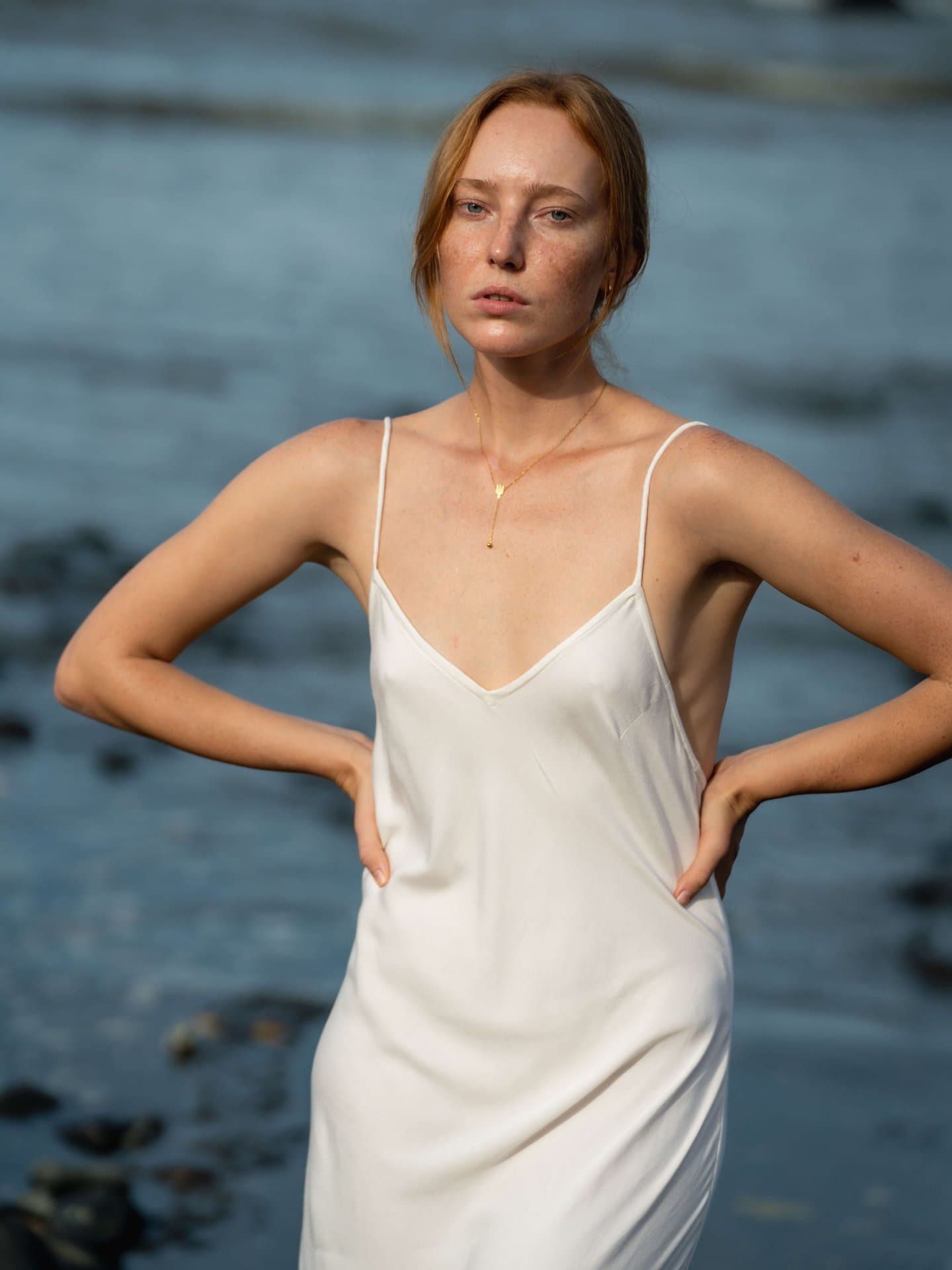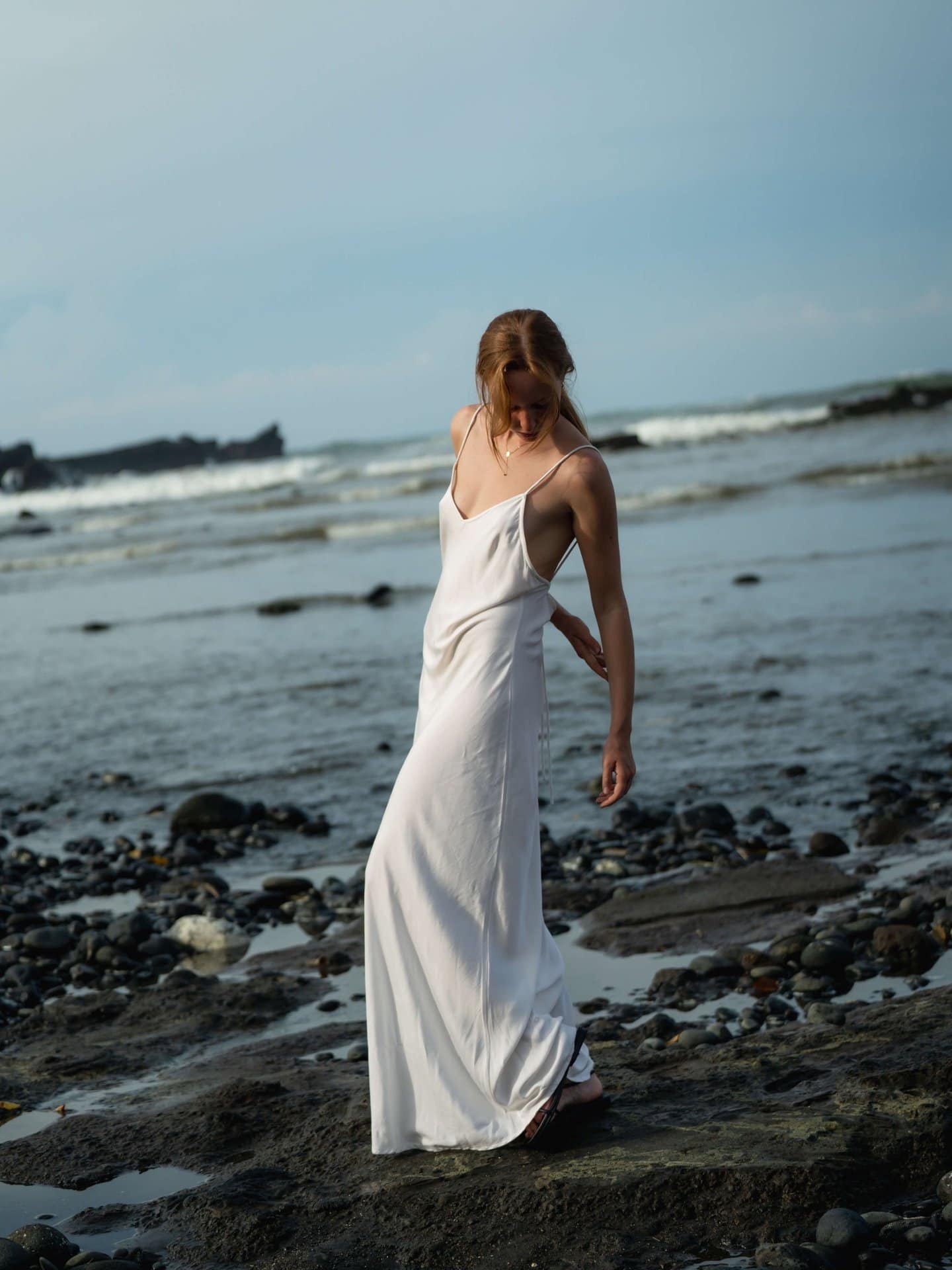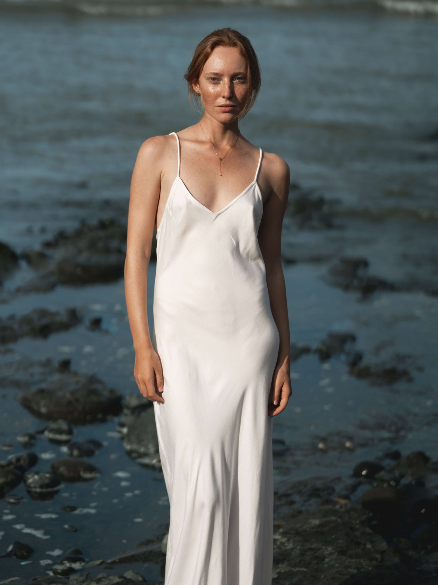 Our summer Seamed Slip Dress has been crafted from bamboo fabric with satin finish. Boasting a V front, low tie-back detail with adjustable drawstring straps. A minimalist design made to travel from beach to evening, alone or layered.