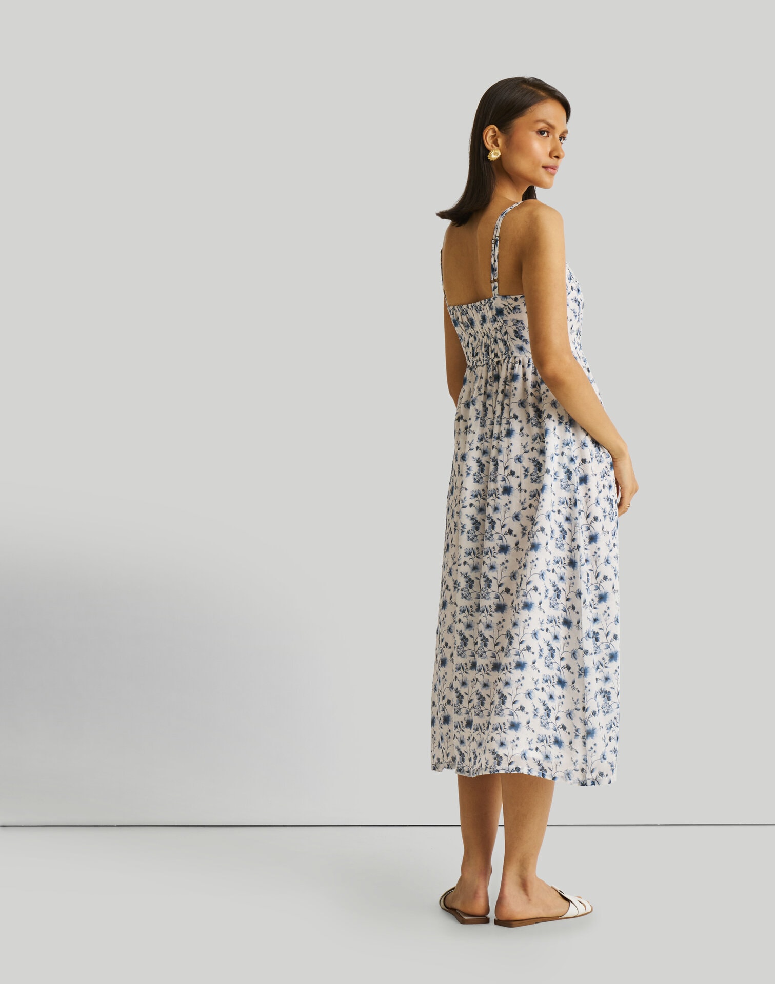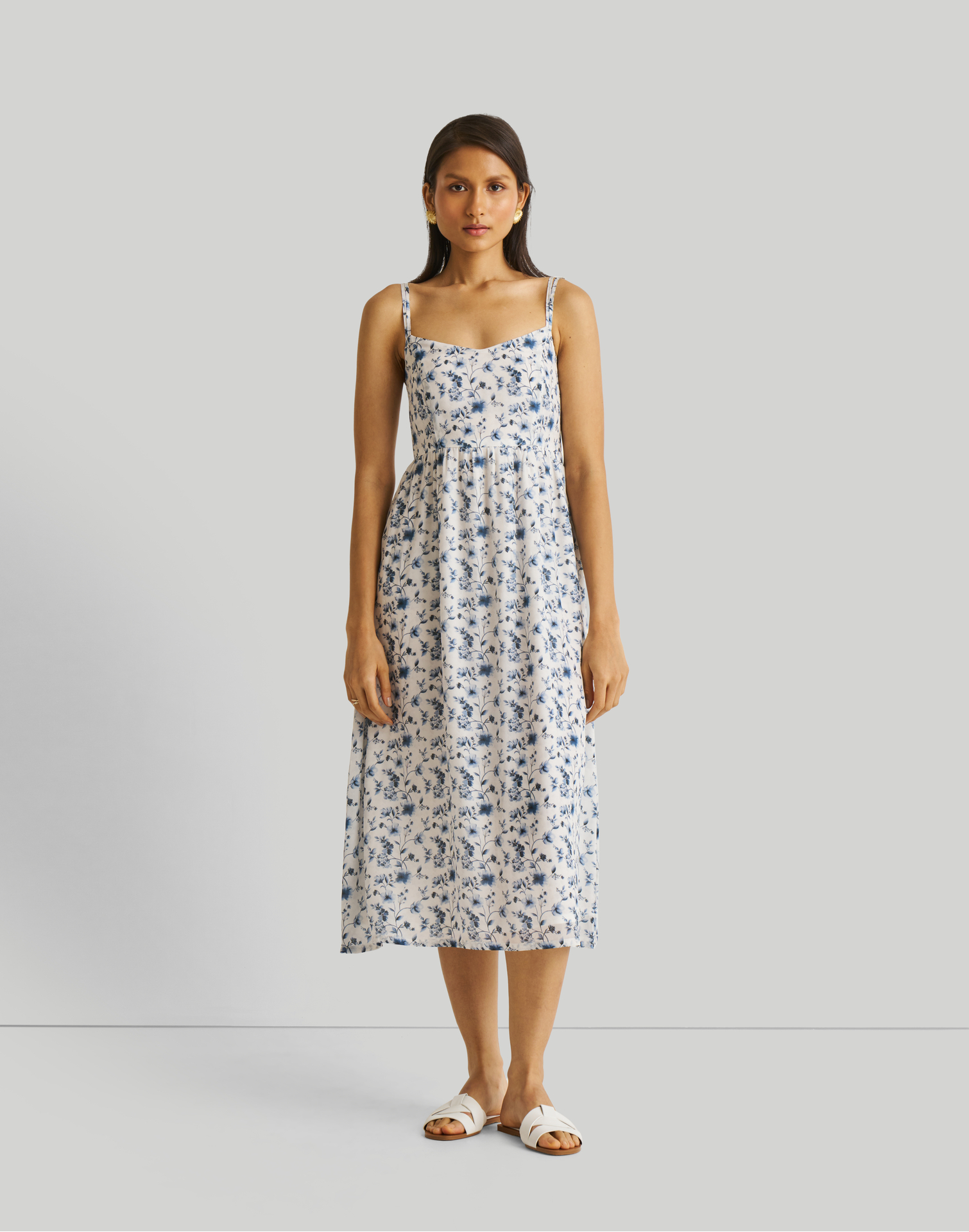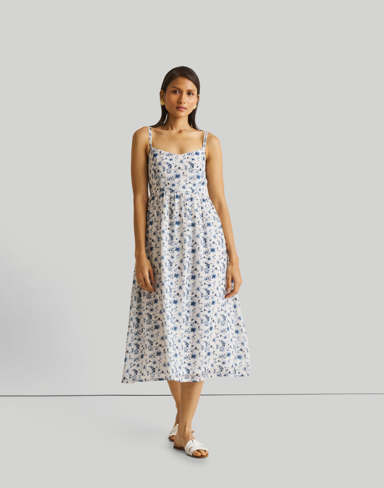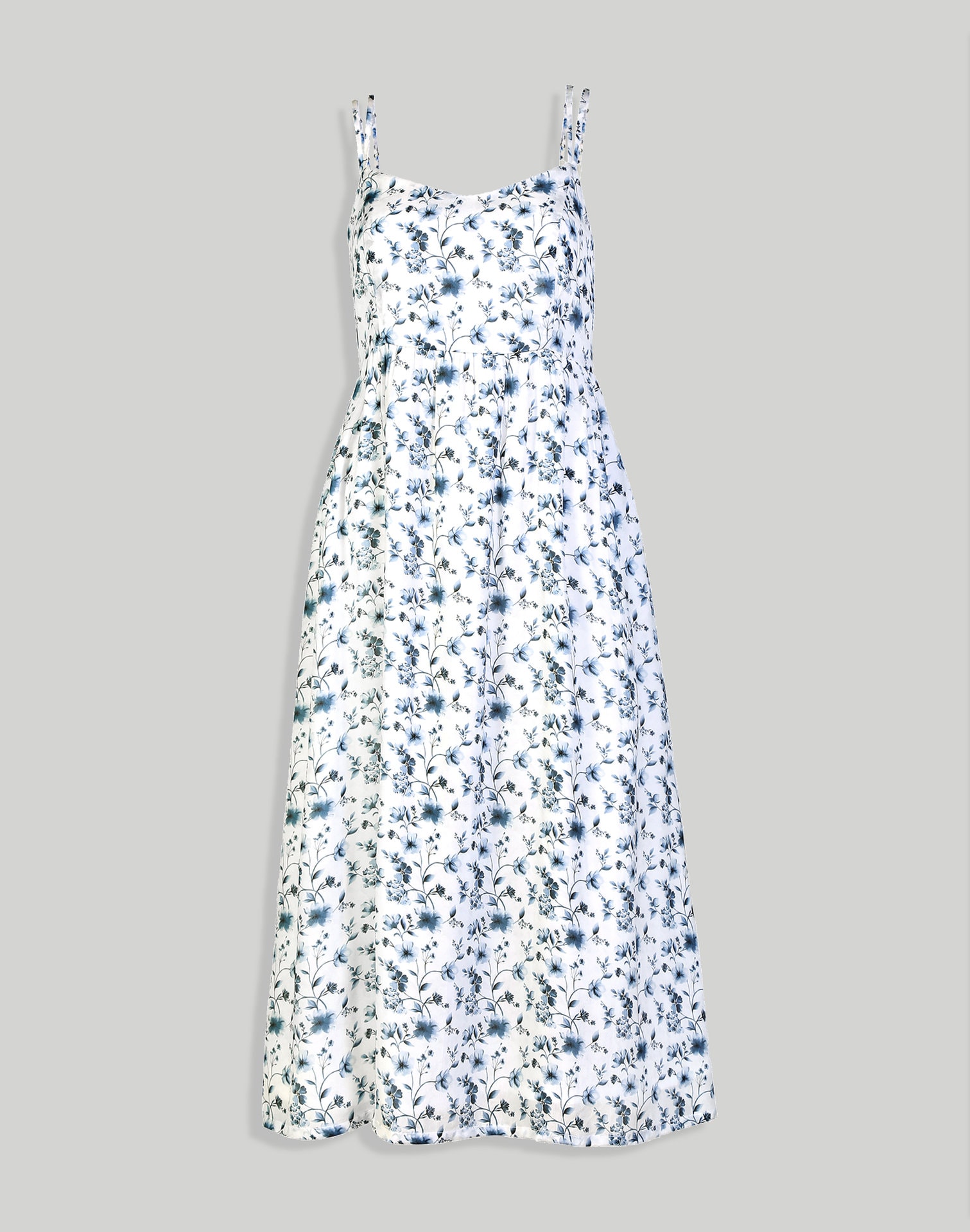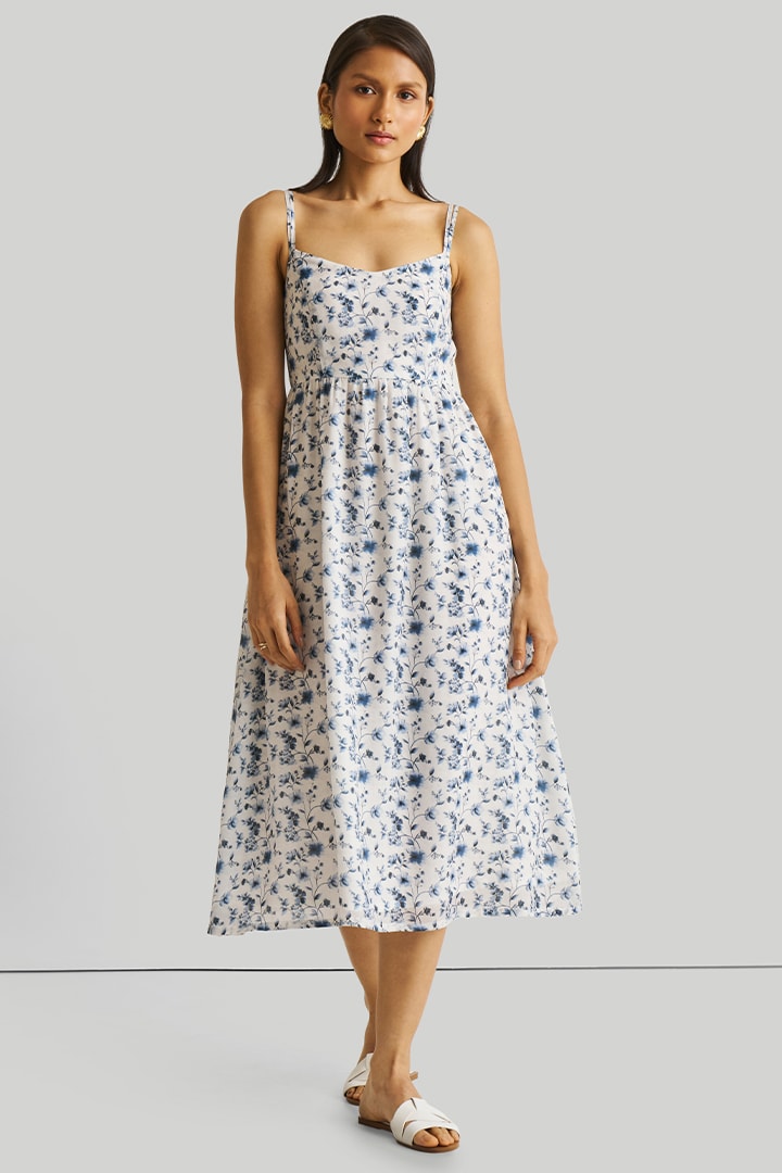 Strappy Gathered Blue Floral Midi Dress