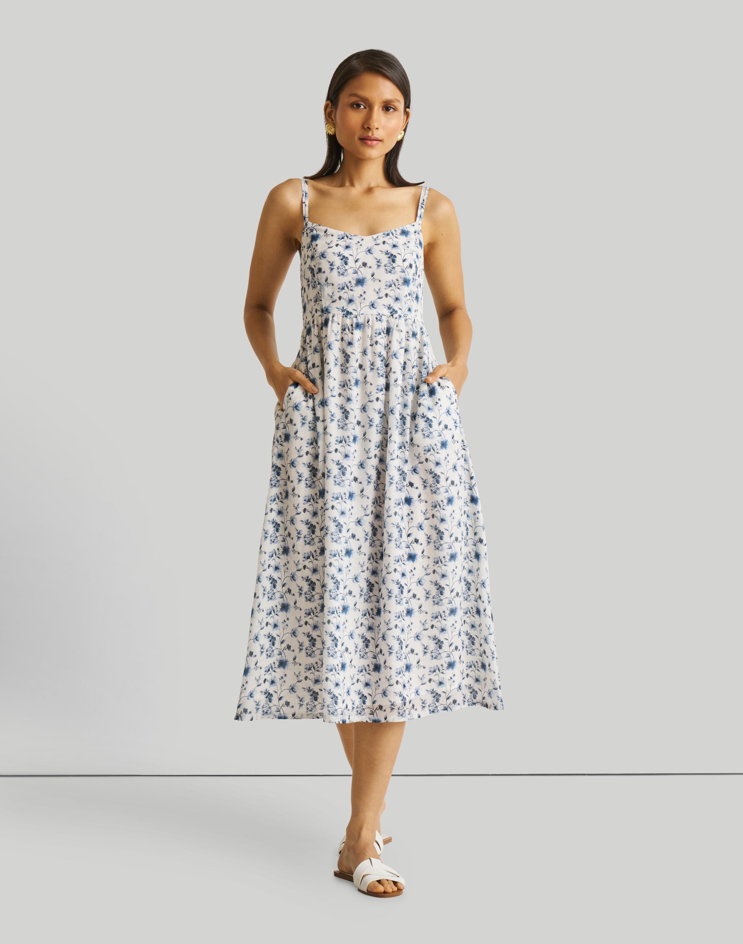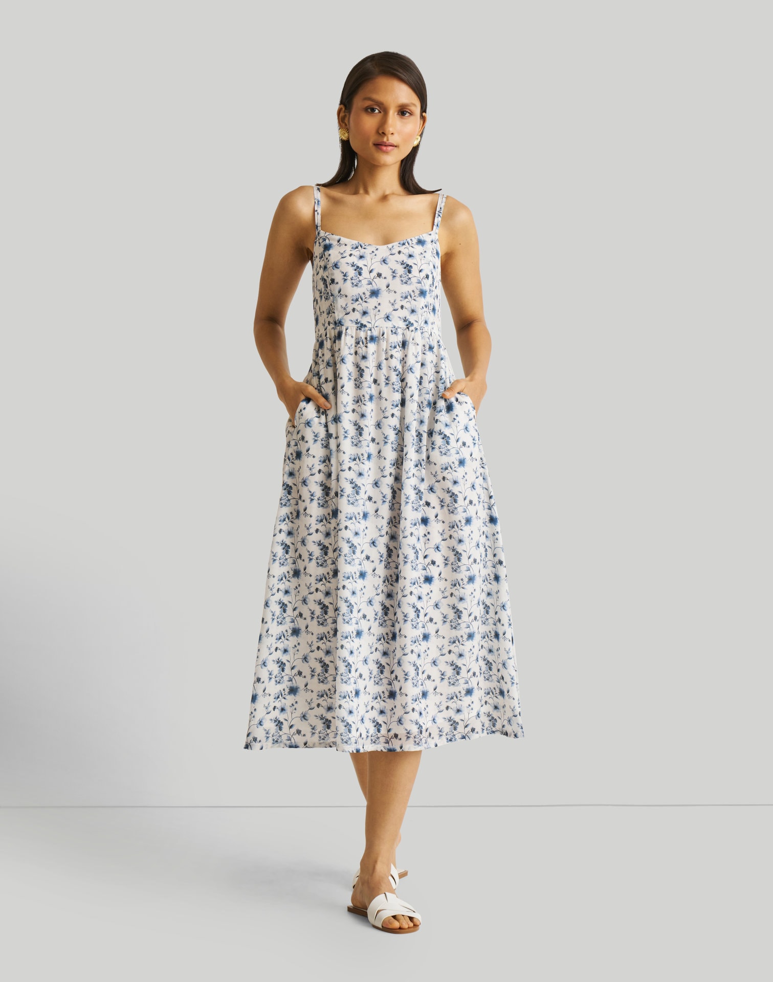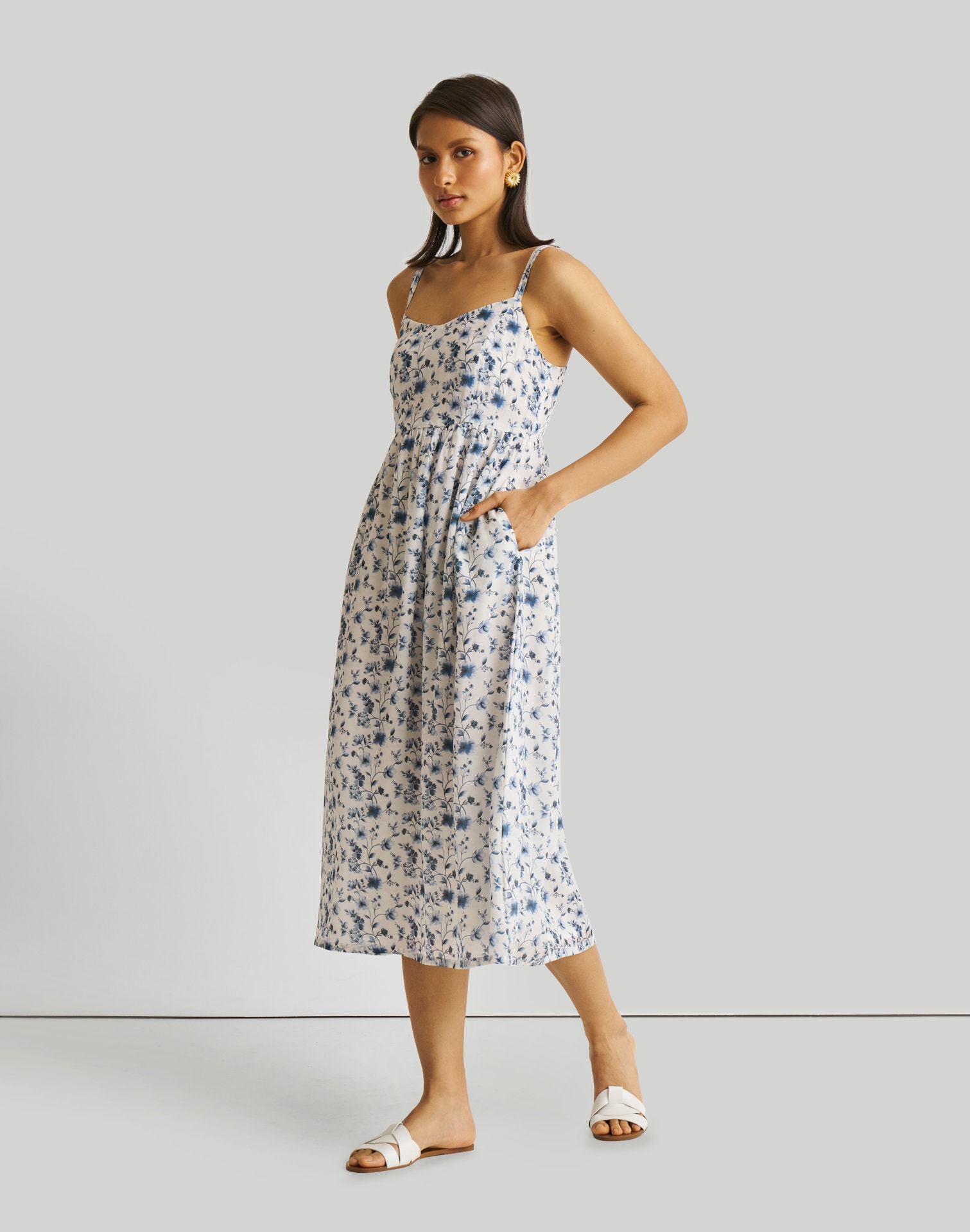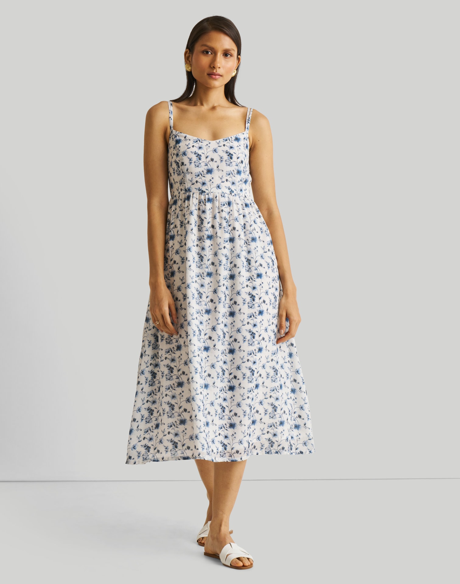 Strappy Gathered Blue Floral Midi Dress