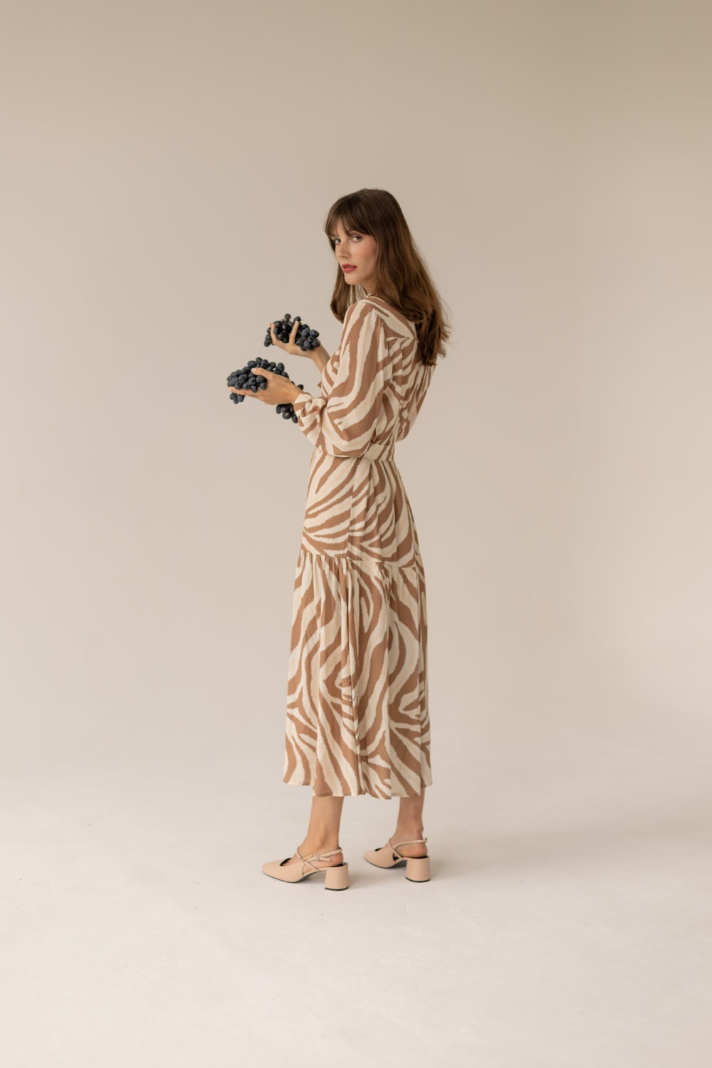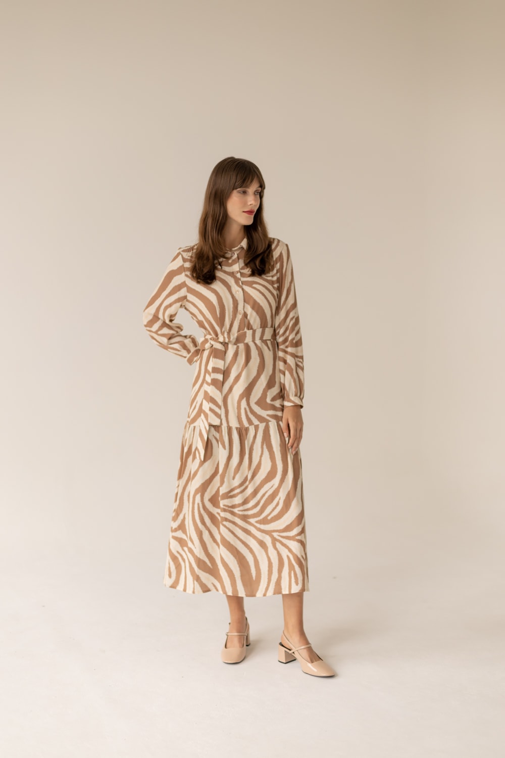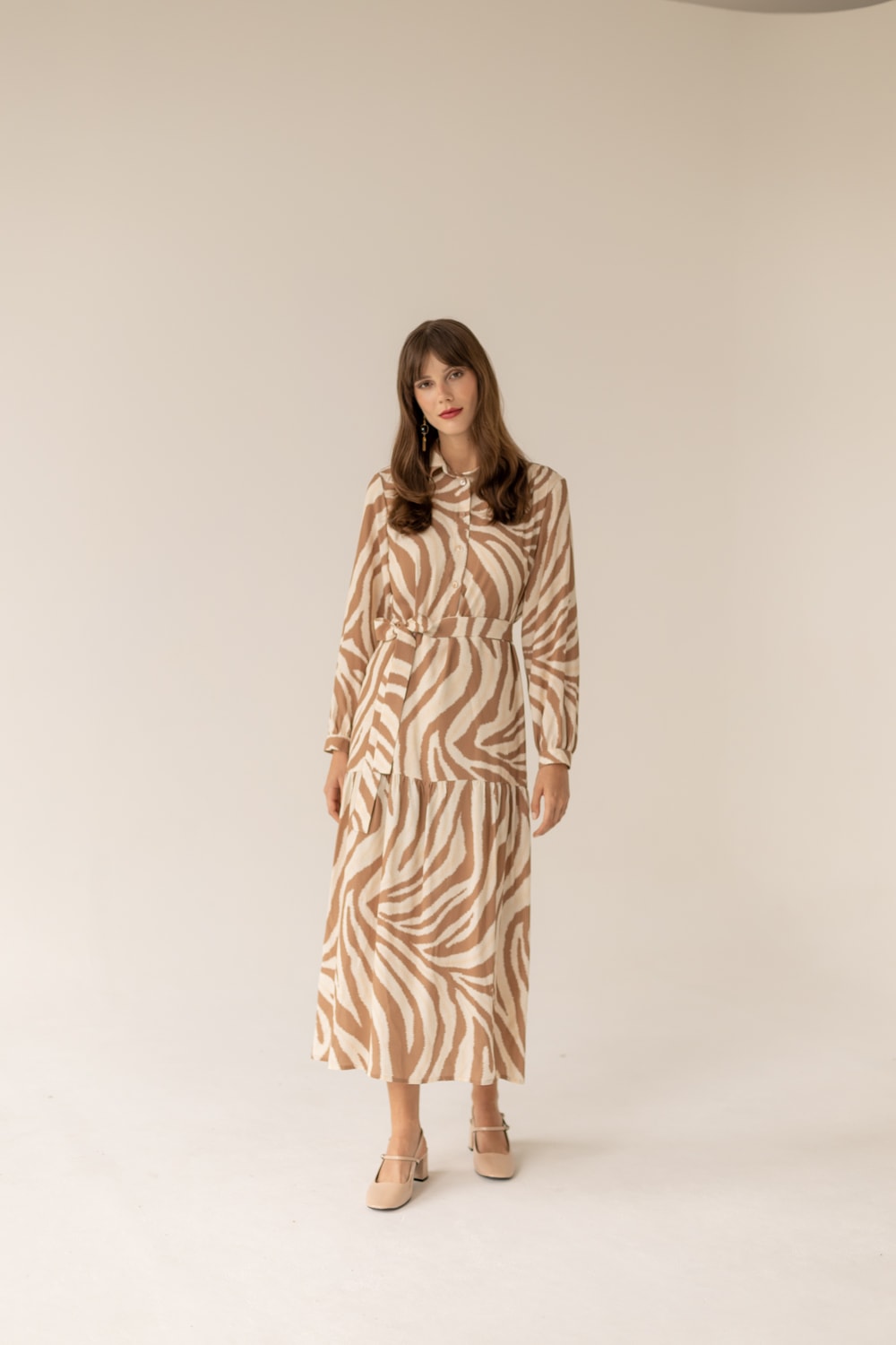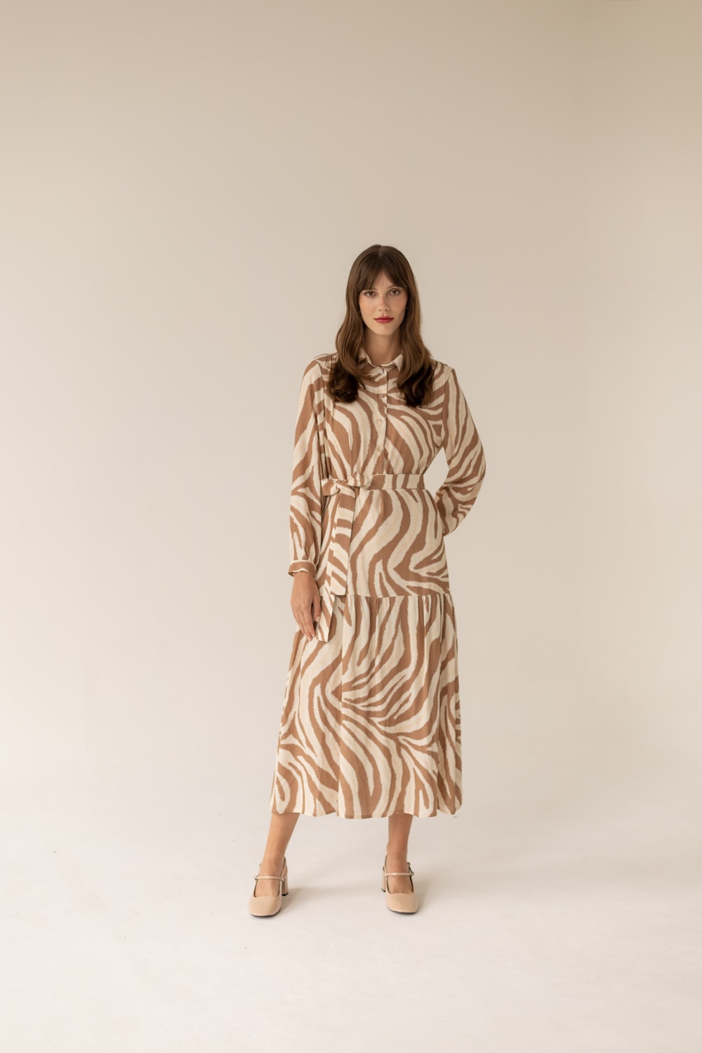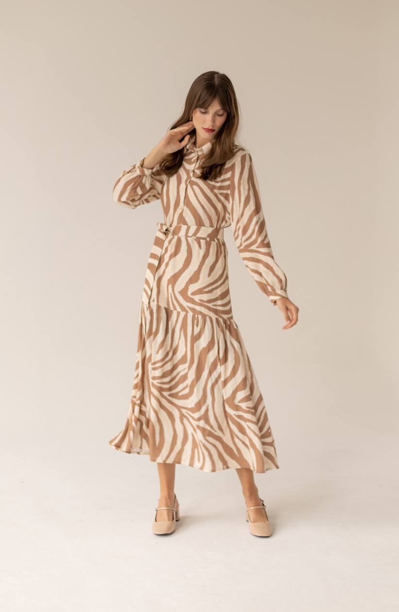 Zebra caramel dress in a loose shirt style with a belt. The dress is cut at the waist and fastened with buttons, has an elegant small collar and shirt sleeves. The bottom of the dress is slightly flared with a large cut-out ruffle below the hip line, which gives lightness to the silhouette and at the same time optically slims the hips. The dress is made of beautifully draping viscose, with our original zebra print in a vanilla caramel color.