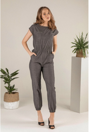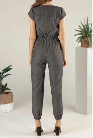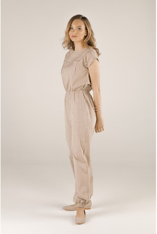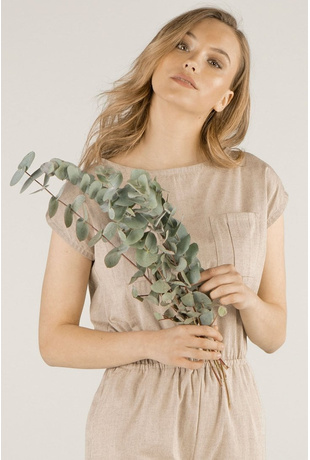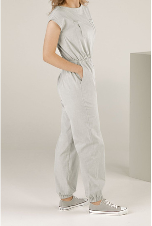 The Mindful Warrior Jumpsuit is such a comfortable cool piece. Just throw it on and you don’t have to worry about putting together an outfit. A slightly baggy fit with an elastic cinched in waist. Also featuring breast pockets for an interesting detail, a classy boat neckline, spacious pockets on the bottom and elastic cuffs gathering the pant leg. Made from a charming handmade organic cotton fabric with character and a lively surface.
