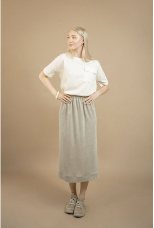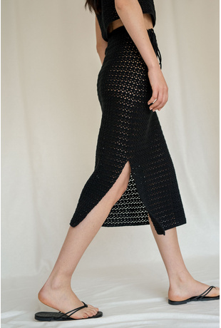 Featuring a mid-length design with an openwork stitch and a side slit placed just above the knee for extra freedom of movement, this skirt is a perfect addition to your wardrobe.