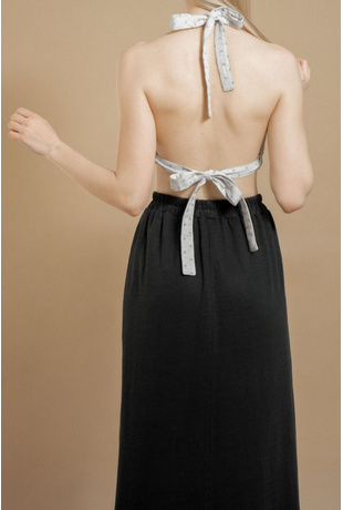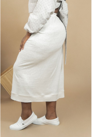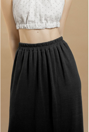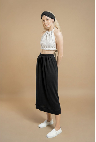 The Oneness Skirt is an easy breezy linen skirt. Casual style with a gathered waist. Midi length hem with a rib hemline. Organic elastic band on the waist with a smocking stitch over it. Made from a very special organic linen jersey fabric with a luxurious feel to it.