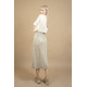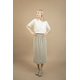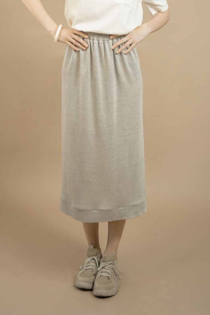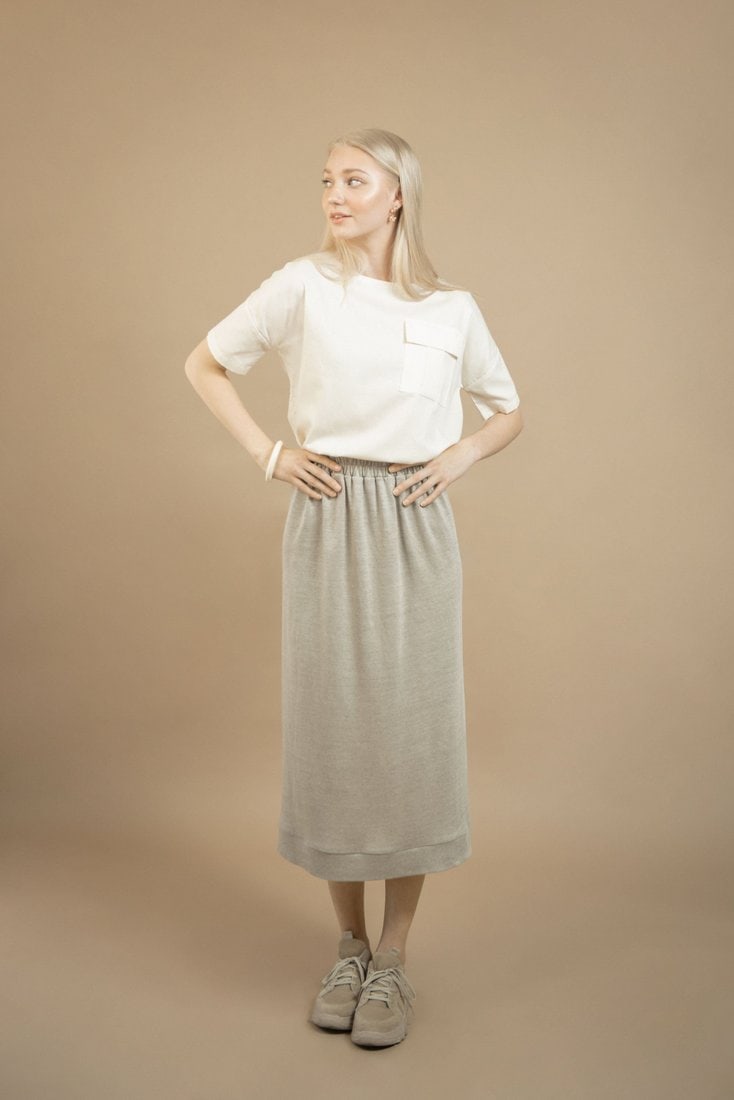 The Oneness Skirt is an easy breezy linen skirt. Casual style with a gathered waist. Midi length hem with a rib hemline. Organic elastic band on the waist with a smocking stitch over it. Made from a very special organic linen jersey fabric with a luxurious feel to it.