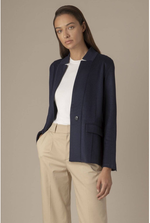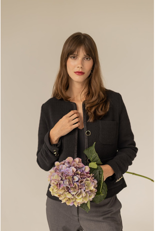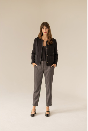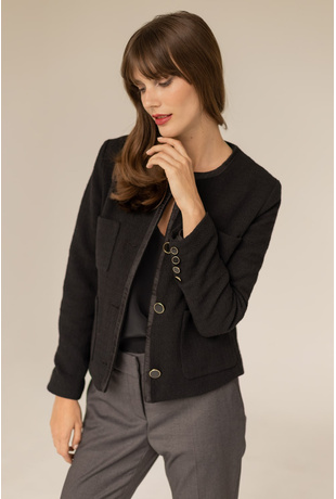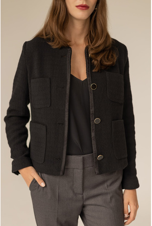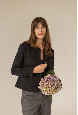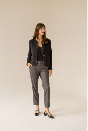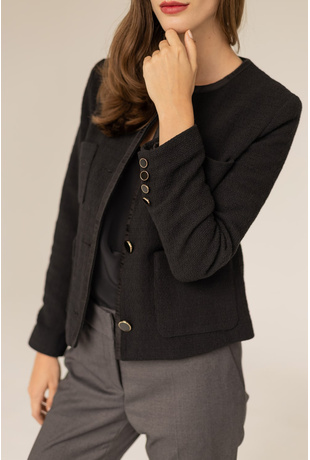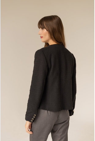 The Jane jacket is our version of the chanel jacket, elegant but casual at the same time, perfect with jeans or dark trousers. The jacket has a box shape, round neckline, decorative pockets and is finished with black piping. The jacket is made of thicker and thicker fabric. The color of the jacket is classic black, the lining is in the tone of the fabric and decorative black buttons with gold rims. The inspiration for the jacket comes from the style of the Parisian street and fashion editors.