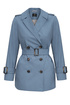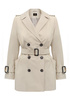 A short light beige trench coat is a classic trench coat in a sporty elegance style. The coat has a slightly looser cut, a classic small collar and shoulder straps. The coat is fastened with double-breasted buttons. Additionally, it has a long buckle strap at the waist and buckle straps on the sleeves that can be adjusted. The coat is made of cotton fabric with a rainproof coating. The coat is in a light, sandy shade of beige, has elegant buttons and buckles in a dark chocolate color with light notes of beige, and a lining with the brand's logo.