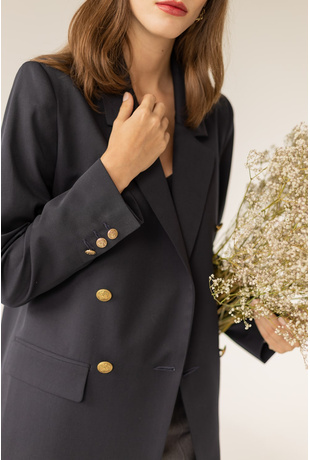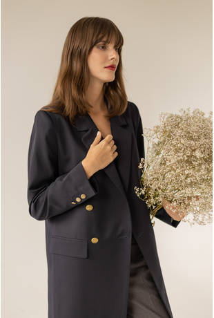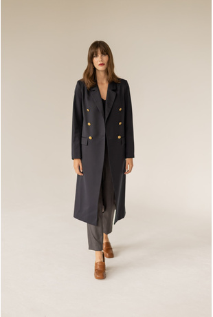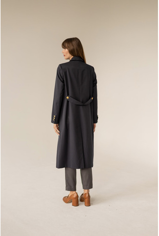 The navy blue trench coat with gold buttons is a classic, elegant long coat. The coat has a slightly looser cut and a classic jacket collar. The coat is fastened with double-breasted buttons in the color of old gold. Additionally, it has buttons on the sleeves and a decorative tab fastened with buttons at the back. The coat is made of a deep navy blue fabric, slightly ribbed, the fabric type is gabardine. This is a specialized fabric for elegant trench coats.