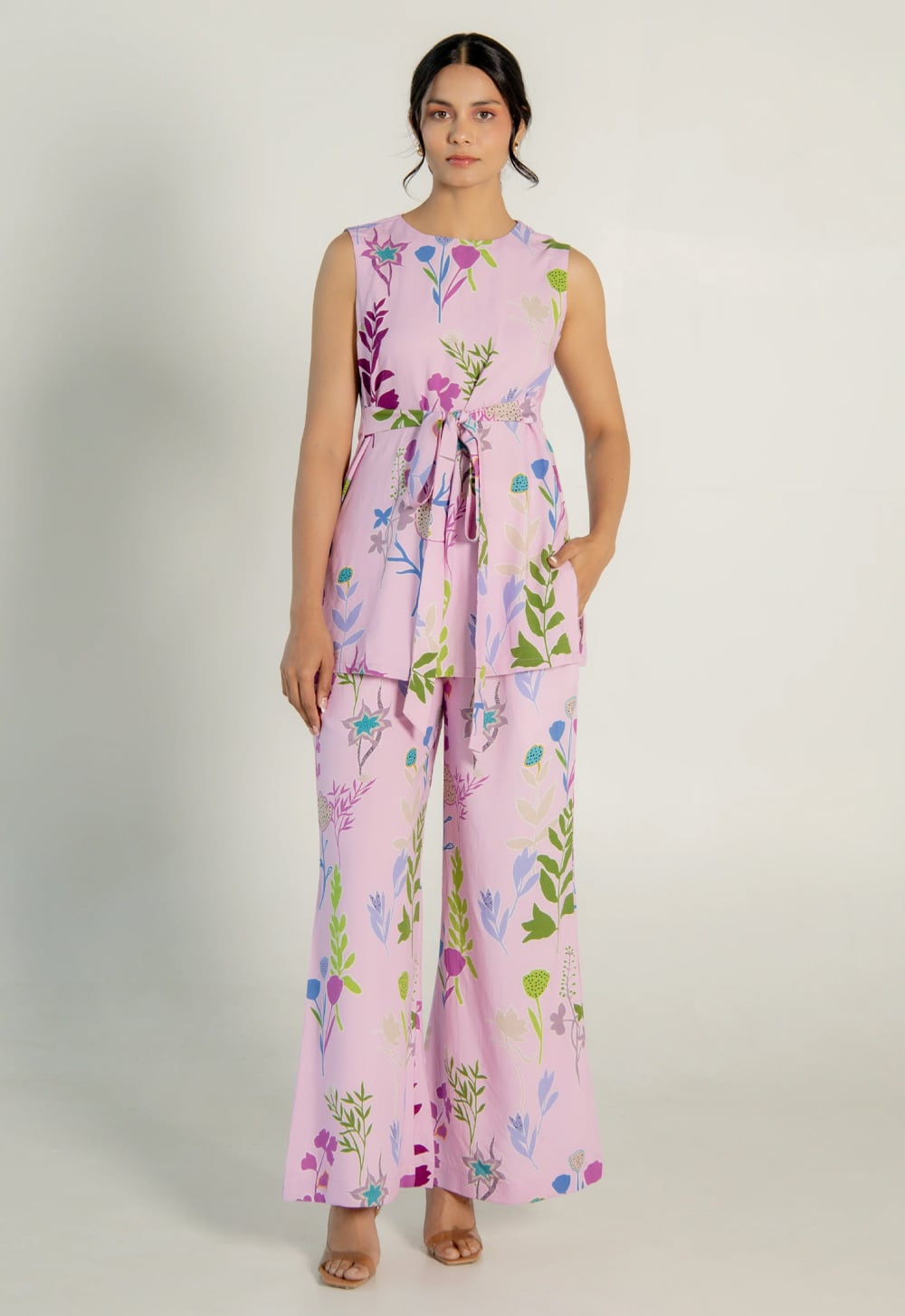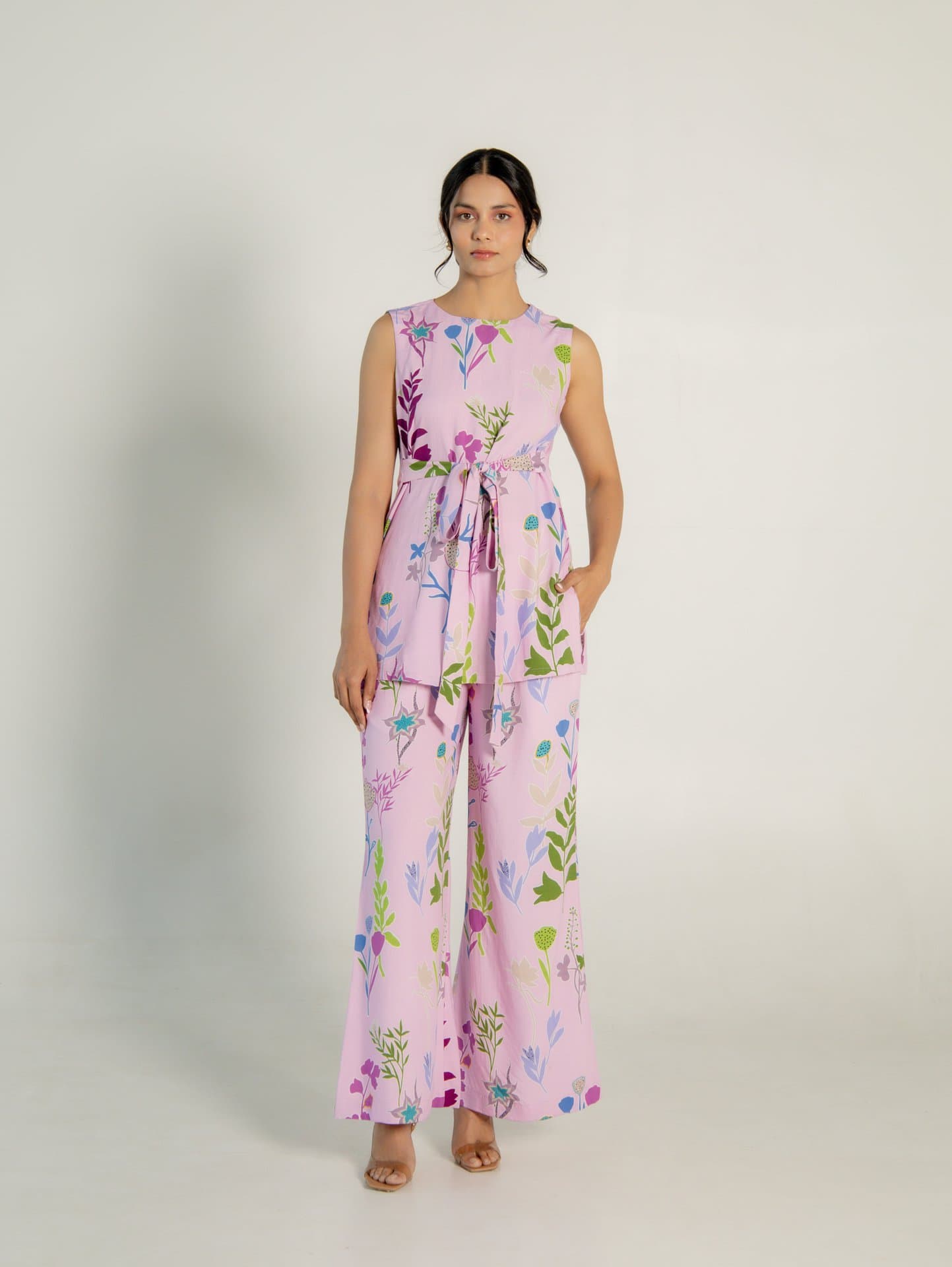 the front and round neck, paired with flared