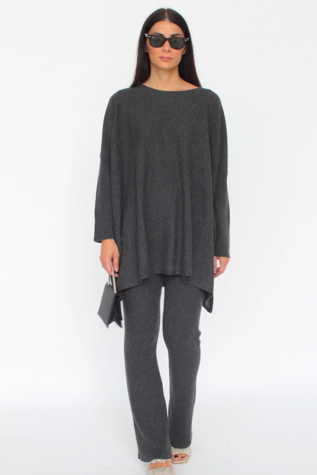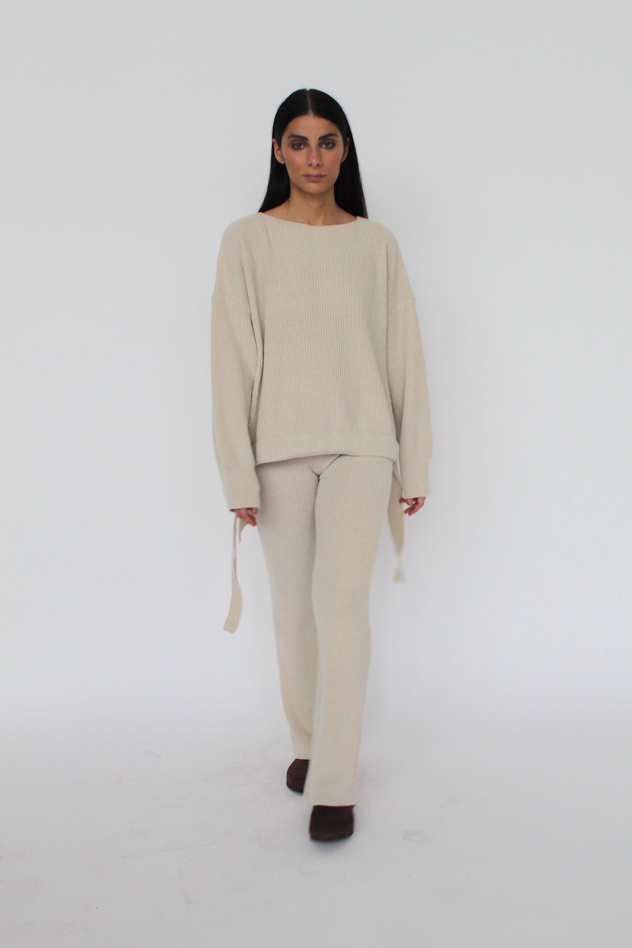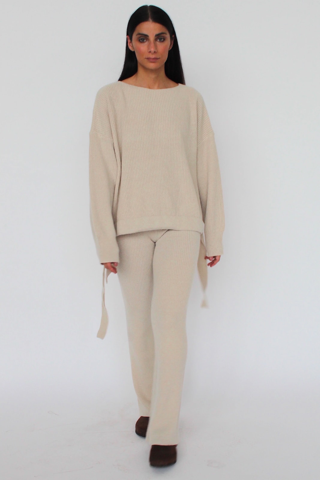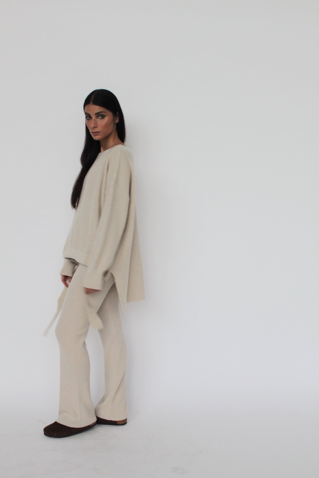 Ribbed knit trousers slightly flared at the bottom with high elasticated waist.