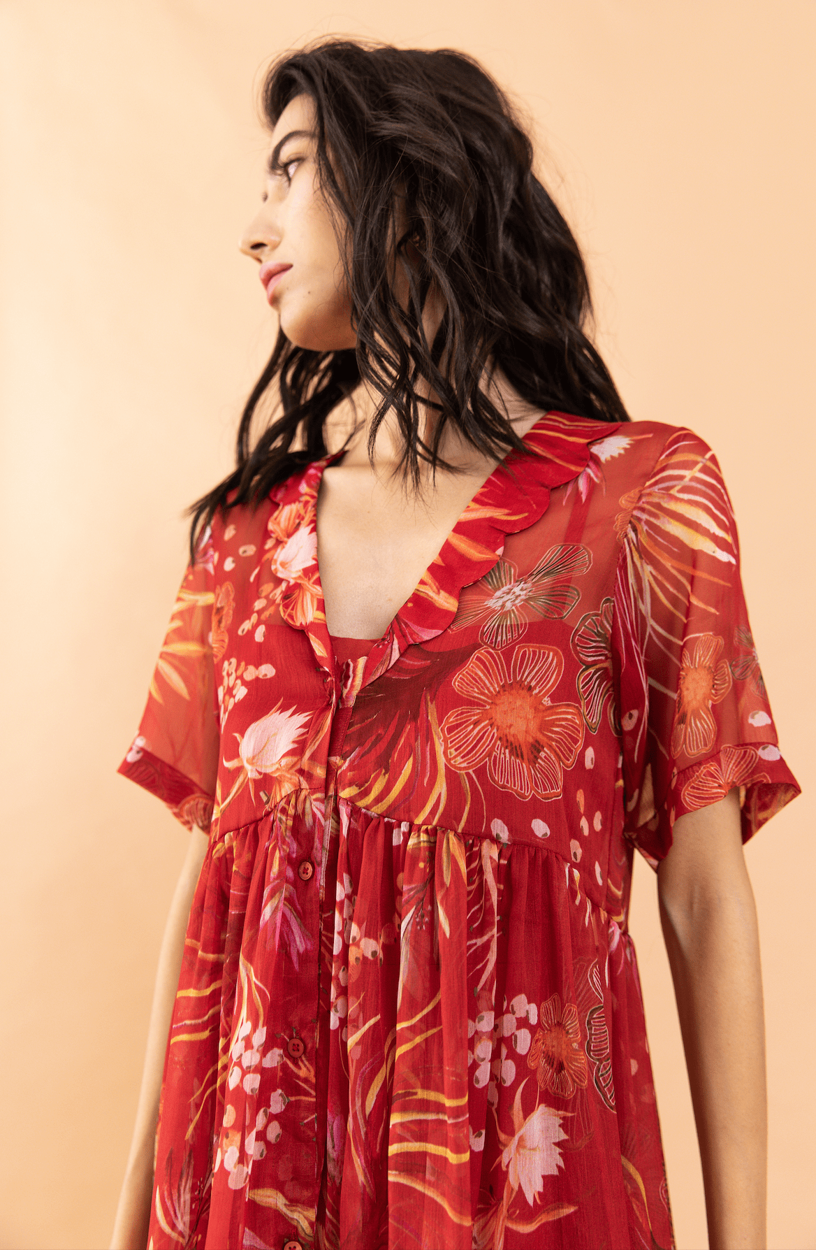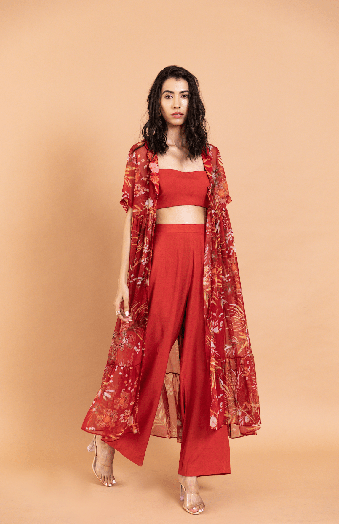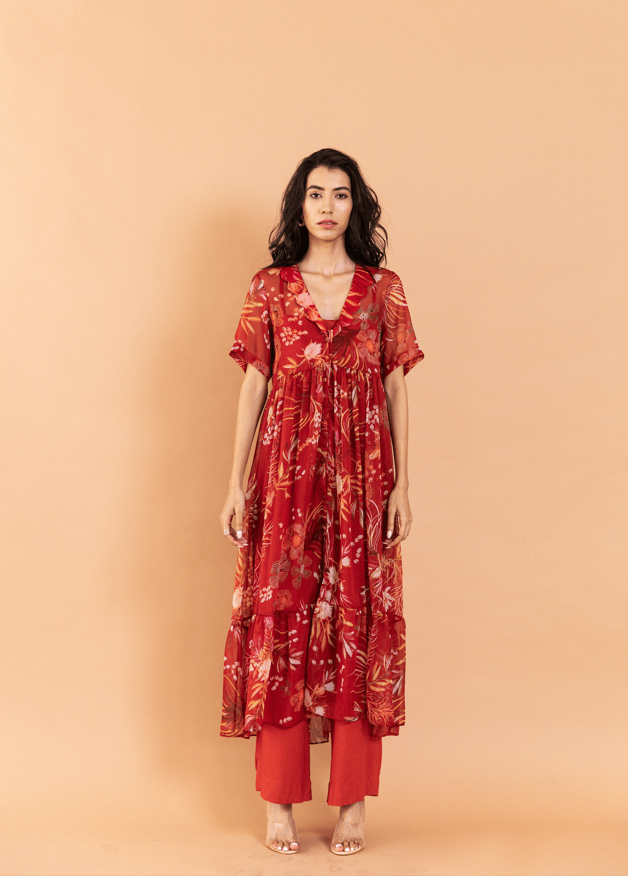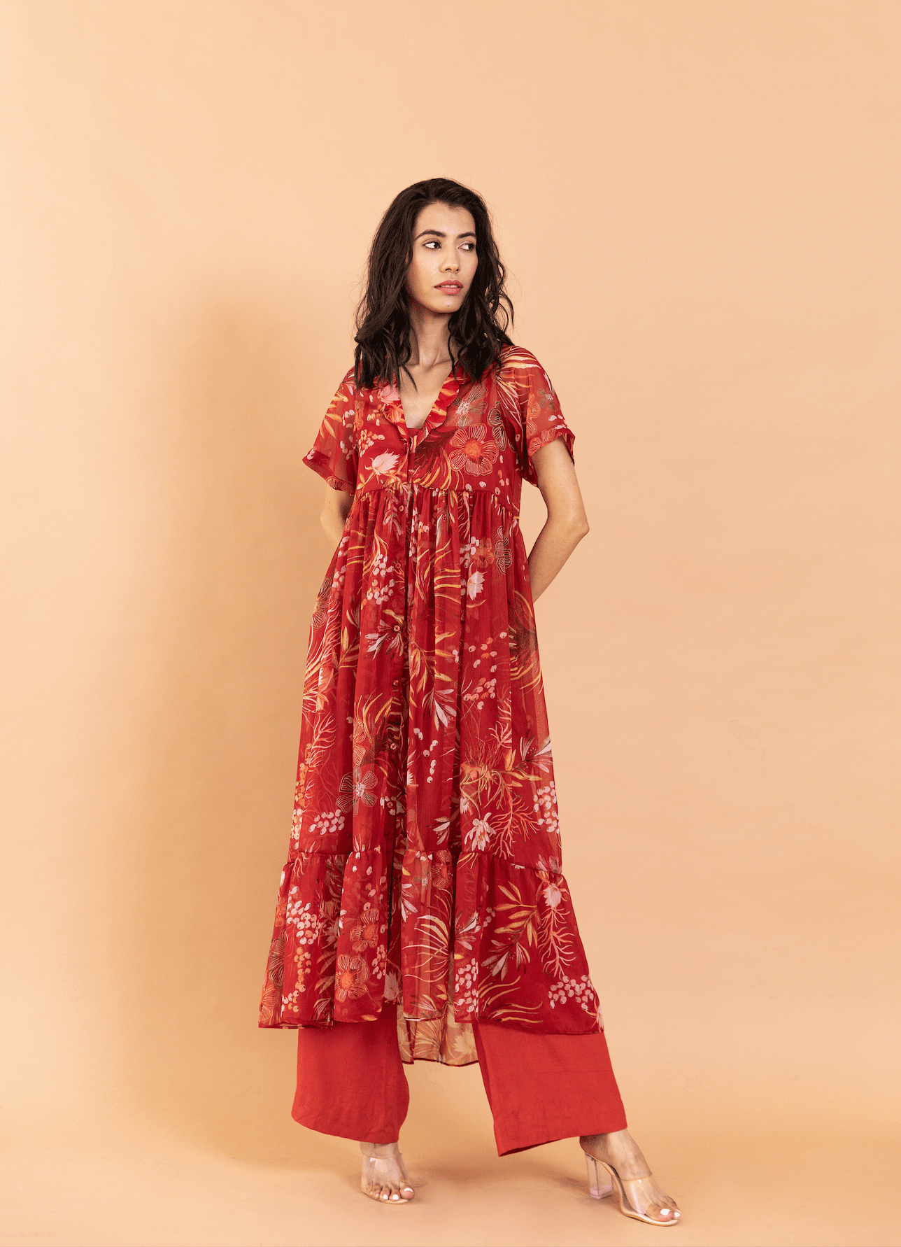 V-Neck with stylised collar, half sleeves, floor length overly paired with tube top and pants, handcrafted in our Amaryllis print in sustainable chiffon fabric.