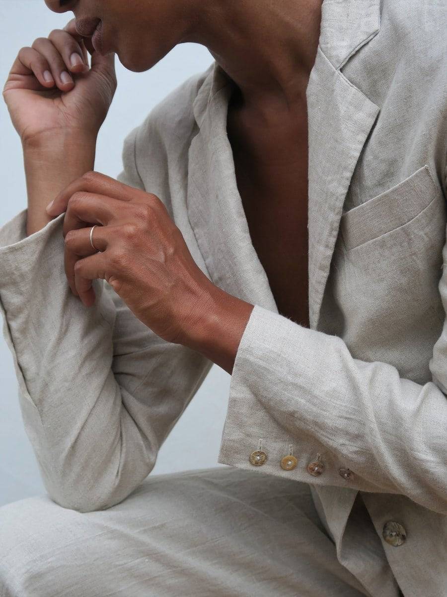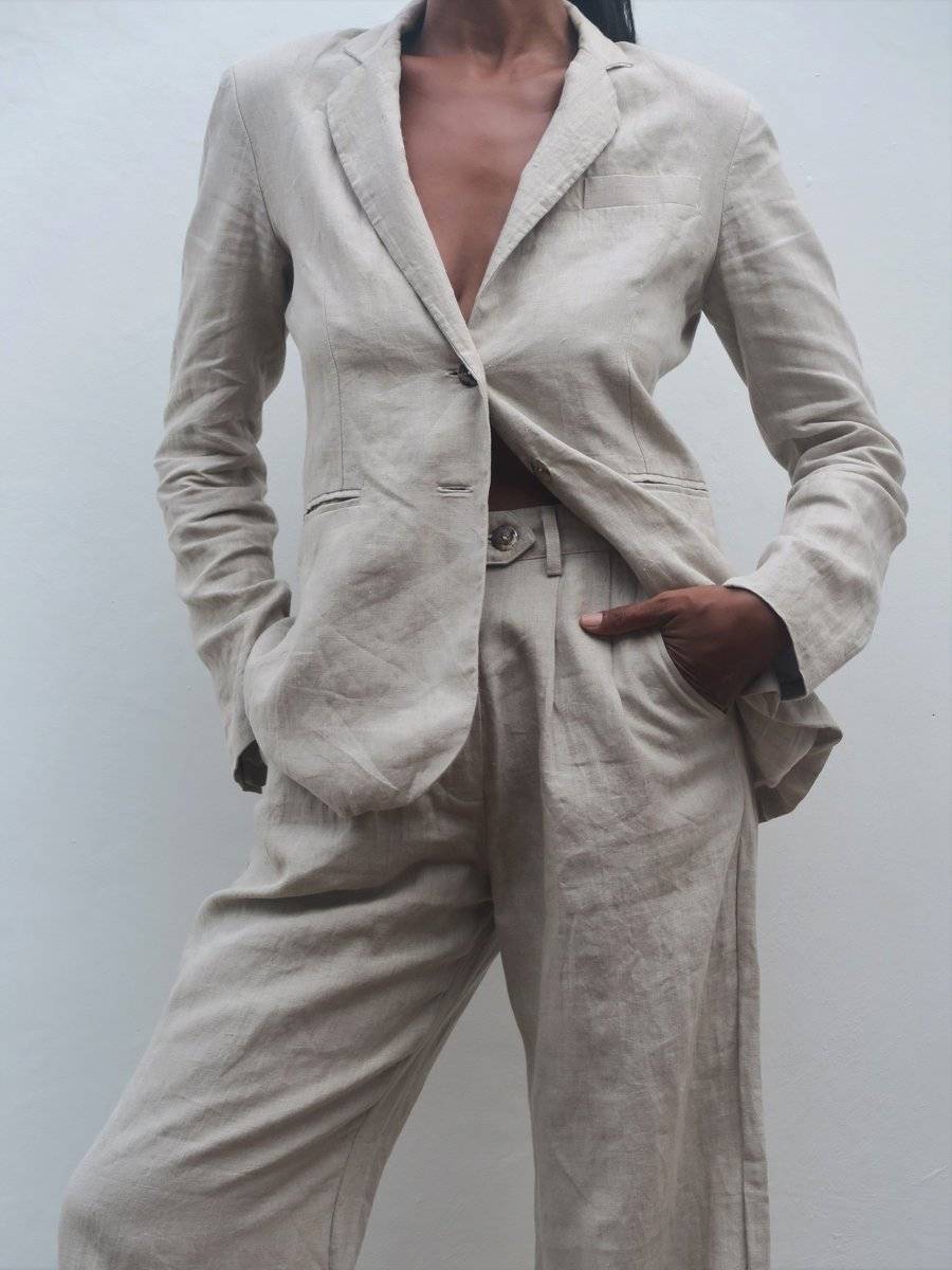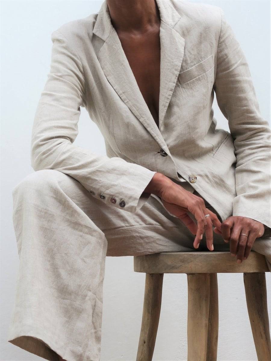 Our crisp, but easy Suit for Fall / Spring or Summer is a versatile wardrobe staple. Made of pure linen. Blazer is lined with lightweight cotton, features flap-front pockets, two buttons, made in sustainable stone.