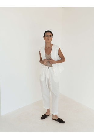 The Soft Wind Trousers are the ideal classic trousers. They have a comfortable elastic waist band yet still look totally sharp, fitting for the work place or any other occasion. Featuring roomy front pockets and mock back pockets for that smart look. A smocked waist and a tapered cuffed leg as details. Made from a fine organic cotton crepe fabric with an airy feel.