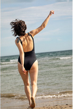 The square back, V-neckline and bows on the shoulders are all part of this one-piece swimming costume's timeless and graphic look. One thing is sure, you'll love it for a long time!
