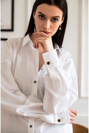 The oversize white dark button down shirt is a loose yet elegant shirt. The shirt was inspired by the style of Parisian women and the shirt from the men's closet. This model is a variation of Classic white oversize shirt only with dark pearl buttons. The shirt is made of cotton poplin, a high quality shirt fabric.