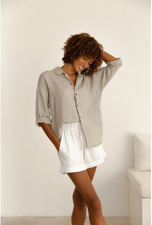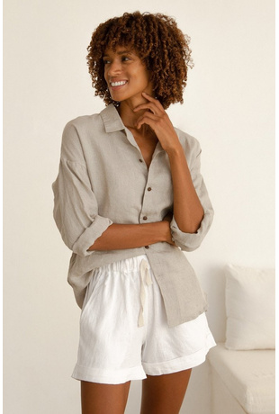 A loose fitting everyday Linen Shirt to be worn buttoned up or as an over-shirt un-done. No sleeve cuff allowing for a loose arm opening, perfect for rolling up. Shaped front & back hem, Self fabric centre-front facing, Coconut buttons and 2 Side pockets for holding extra snacks, your phone on the run & making life in your Shandy Shirt that much more enjoyable! We love this piece due to it's versatility worn on it's own or layered as an overshirt.