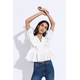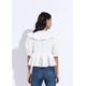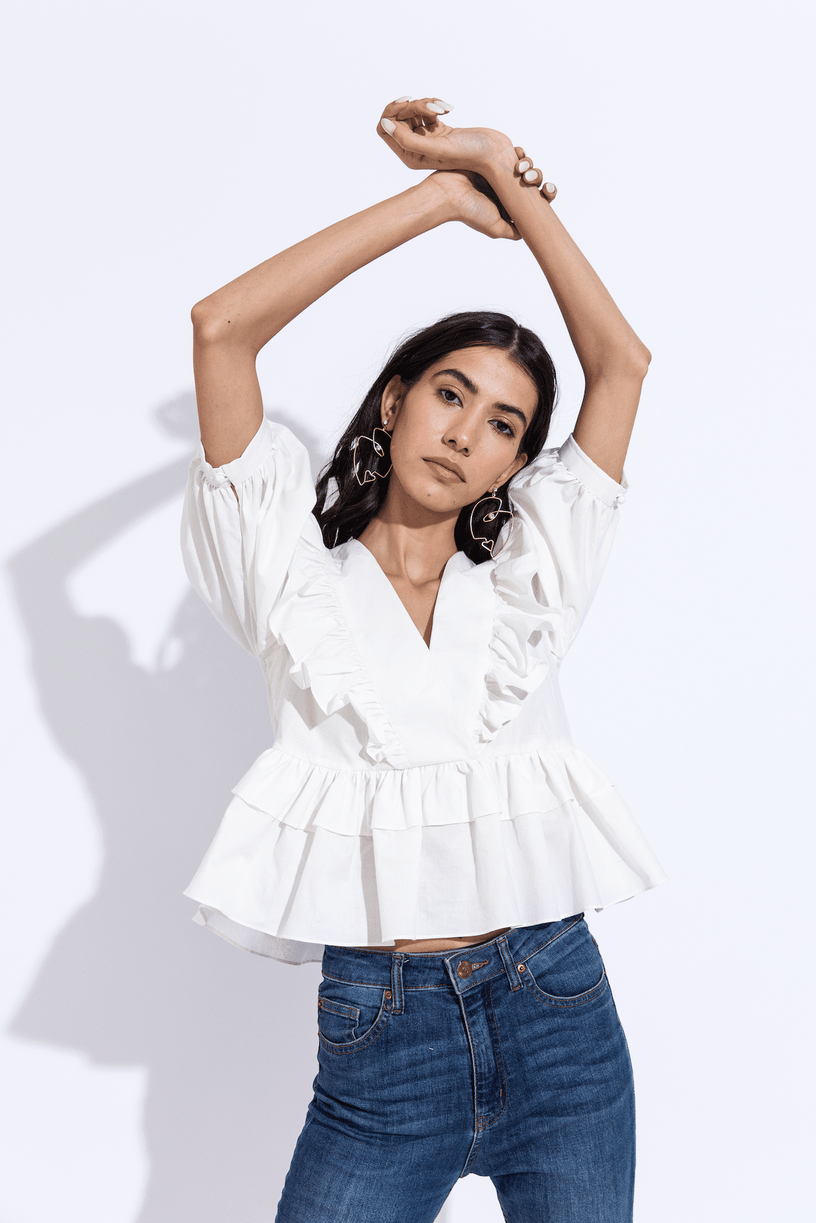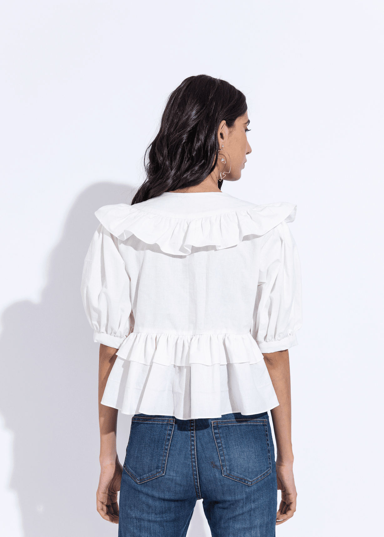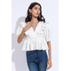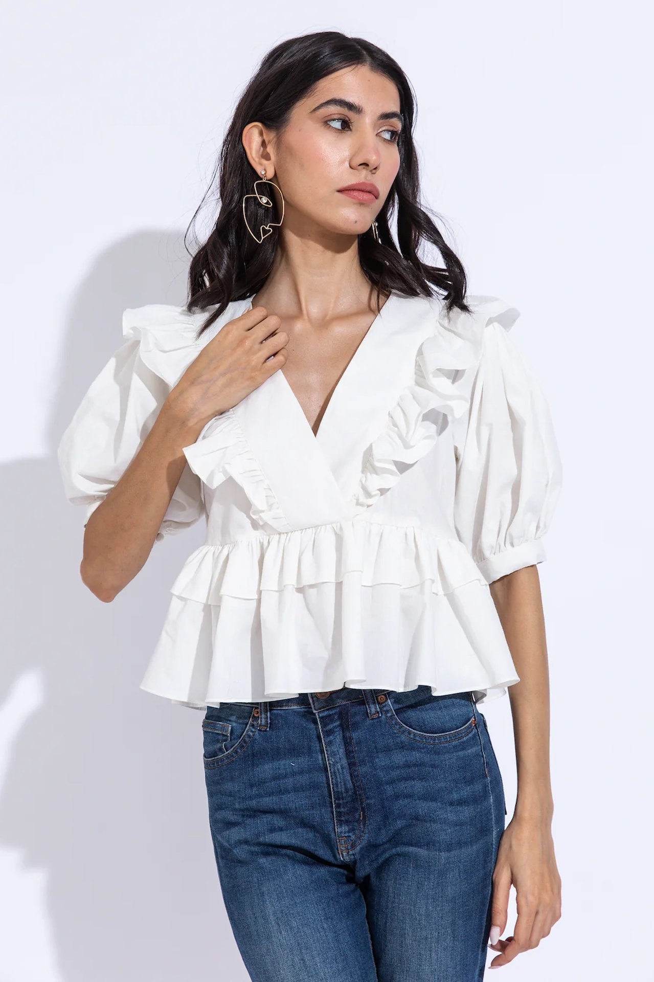 Overlapping V neckline fit and flare top with puffed sleeves and peplum, handcrafted in our sustainable organic cotton fabric.
