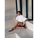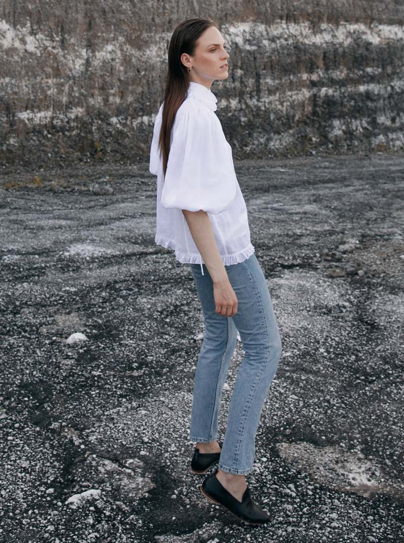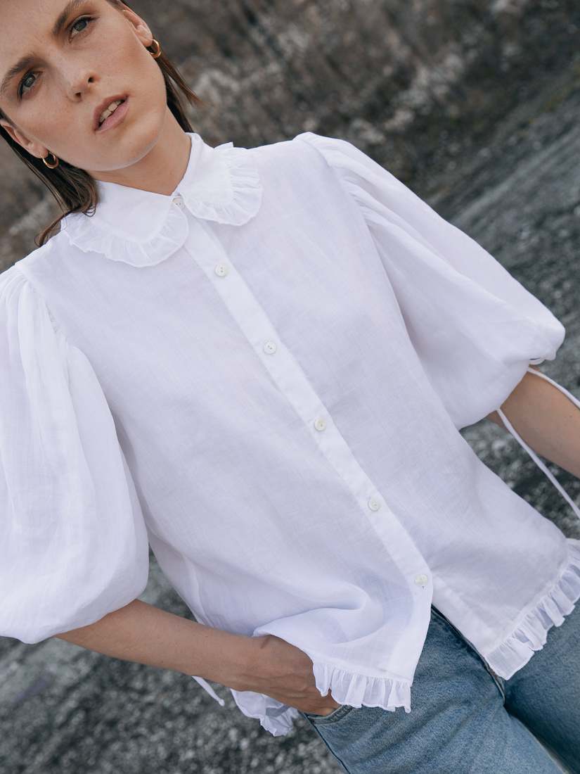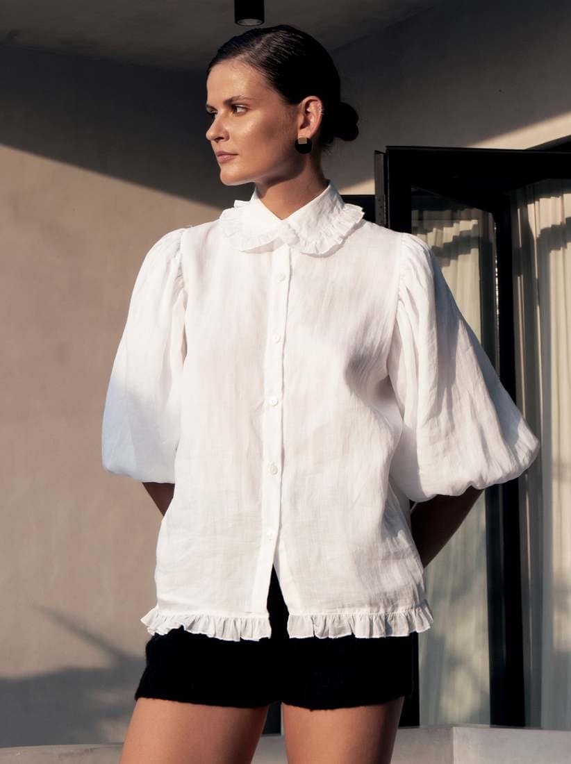 The elaborate Valerie Ramie Shirt combines realism with a large pinch of romanticism. Crafted from 100% Ramie fabric the Valerie Shirt features a lined interior, classic collar with ruffle edge, bubble sleeves and a ruffle at hem edge. Valerie is fitted at the bust and gradually flares out into an A-line shape as it extends toward the hemline. Pair the Valerie Shirt with a pair of denim or our Celine Shorts and the Lori Suede Sandal.