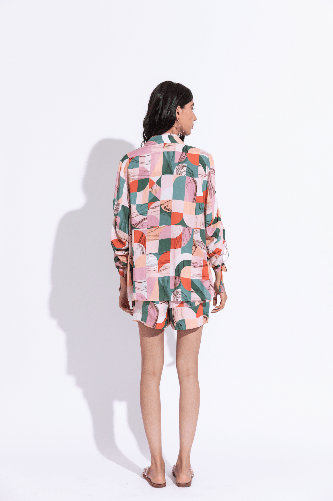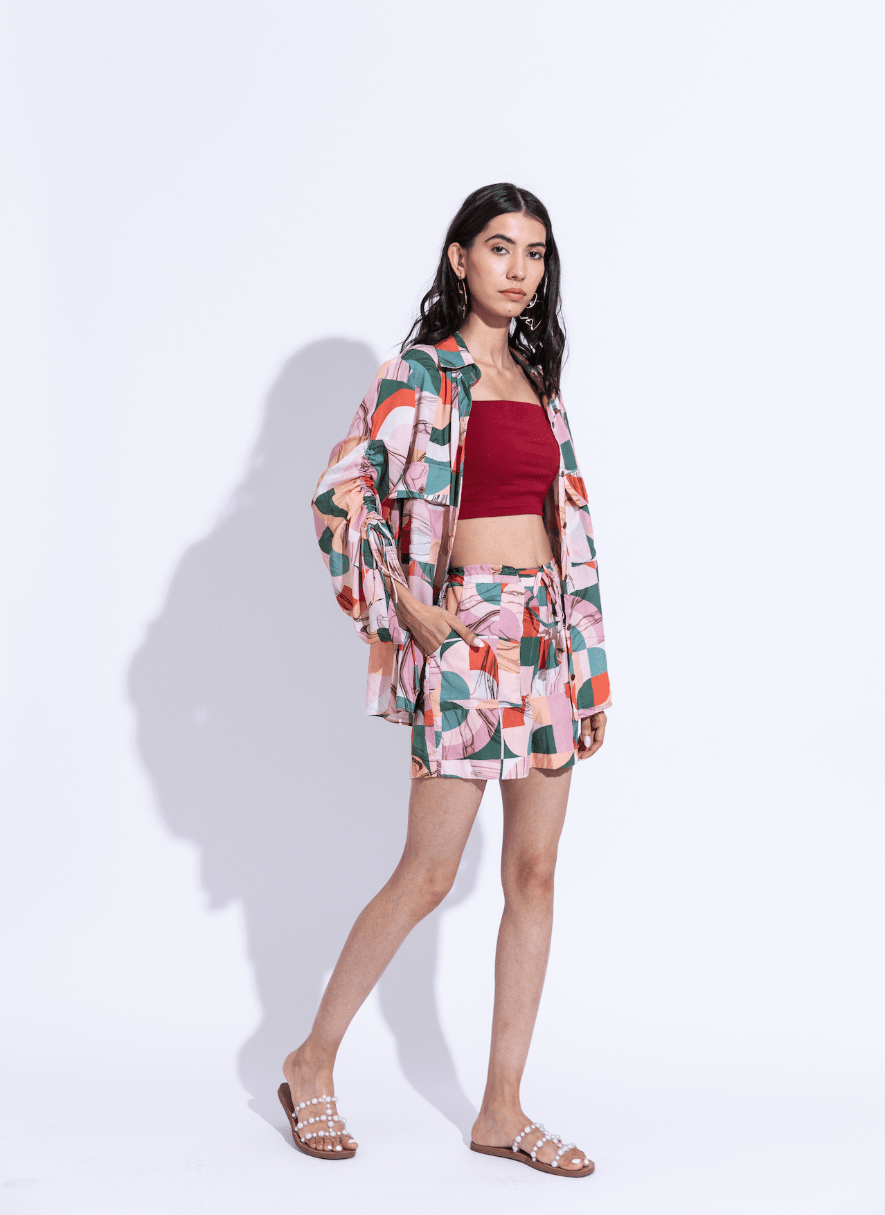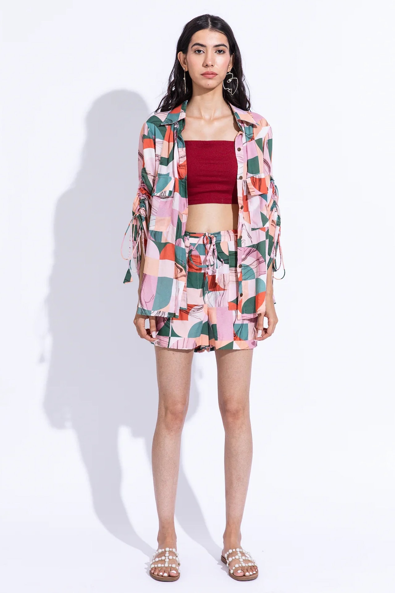 Oversized shacket, with pull up drawstring detail on the sleeve and bold pockets, paired with comfort fit panelled shorts, handcrafted in our azalea print in sustainable cotton silk fabric.