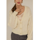 The ecru Mia cardigan is a short cardigan with a loose box shape. The cardigan is made from an extremely soft super kid mohair yarn with a longer pile. The cardigan has a slightly dropped shoulder, ribbed hem and cuffs, and slightly puffed sleeves at the cuff. It is fastened with three mother of pearl buttons with a gold rim.