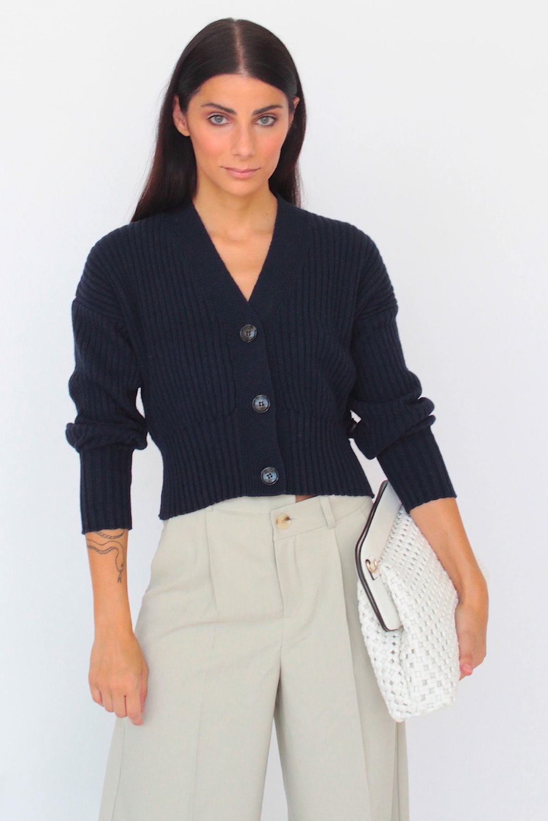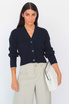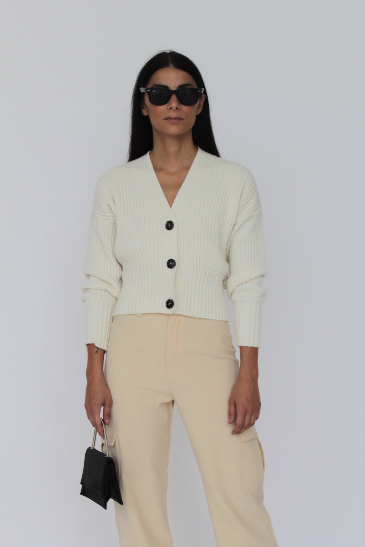 Ribbed cardigan with button closure and detail on the back.