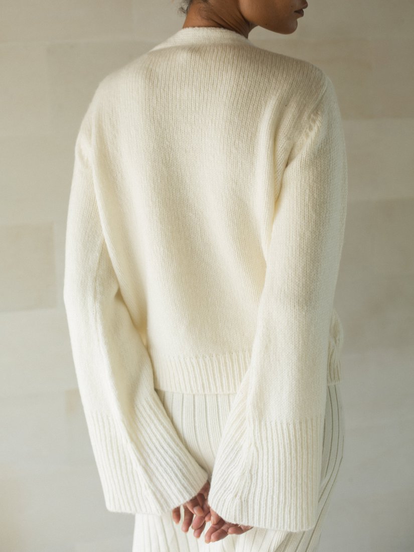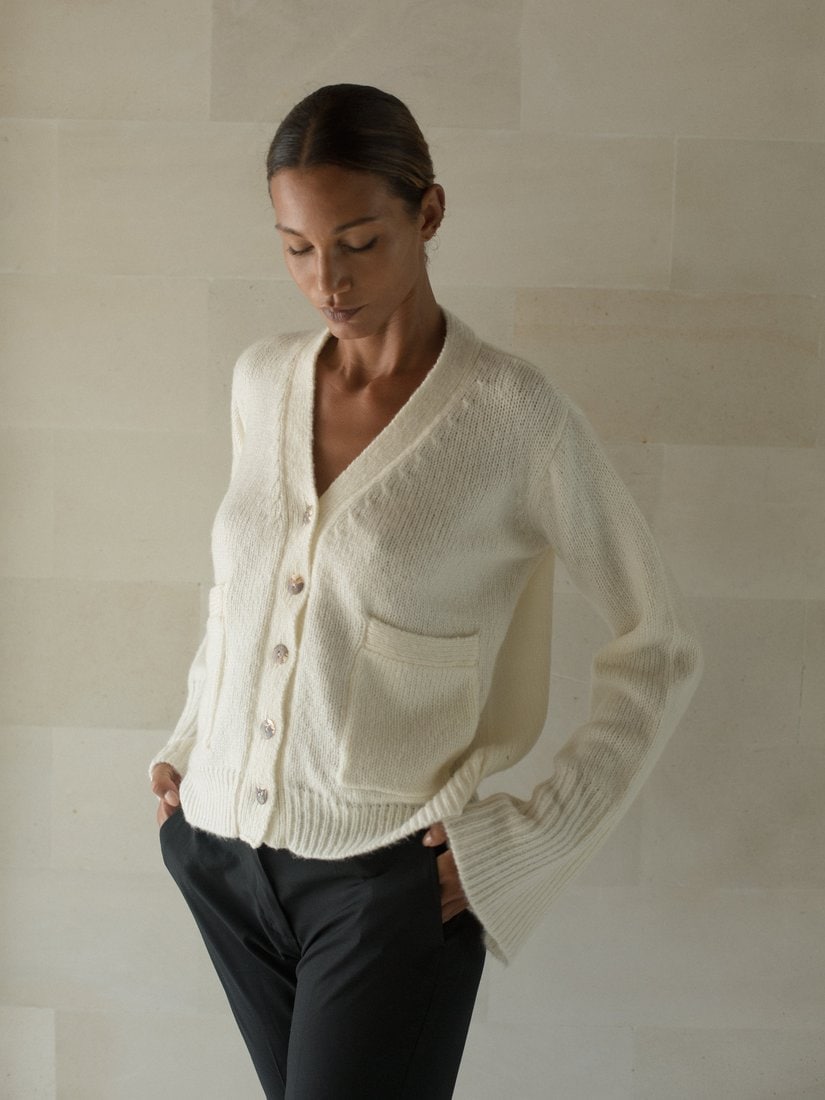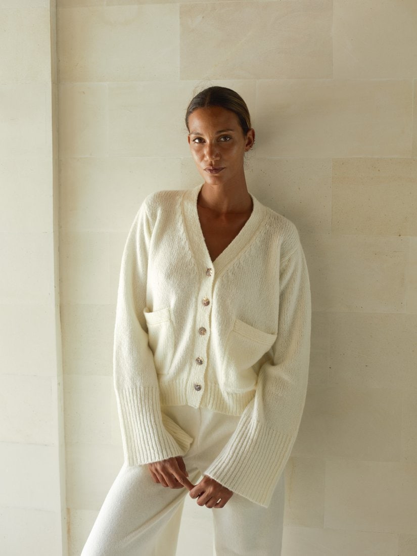 Sophisticated and transeasonal favorite knit. The Iman Mohair Cardigan is crafted from the finest knitted mohair. Designed to throw on top of any of l u • c i e e signature style. Chantal pairs Iman with the Gael Knit Dress.