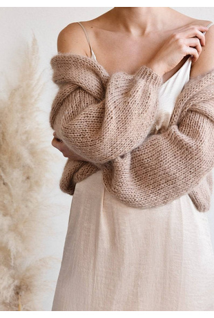 The Mohair Bomber Cardigan, a chunky open-front cardigan hand knitted in fluffy kid mohair that feels like being wrapped in a soft, puffy cloud.