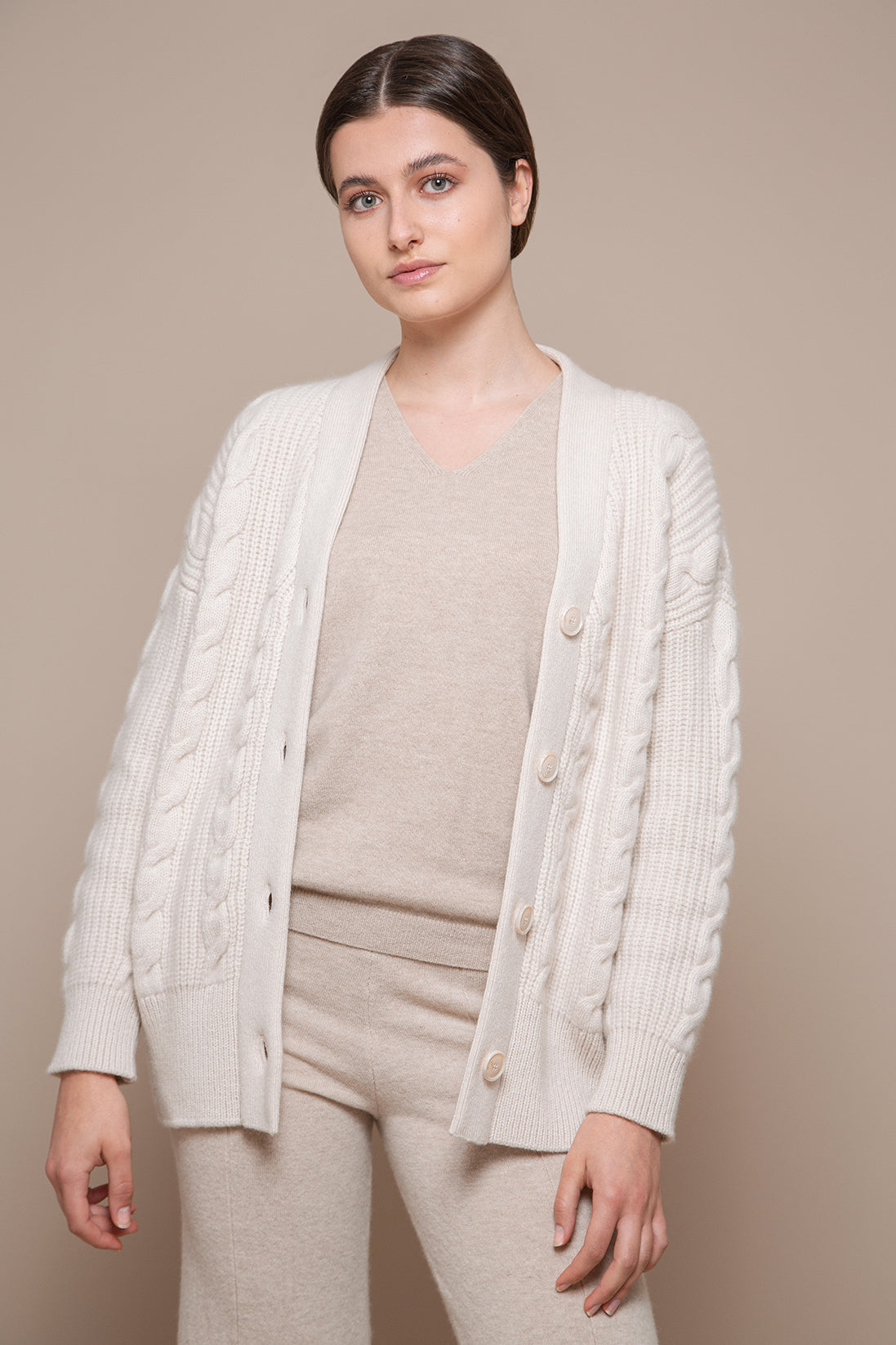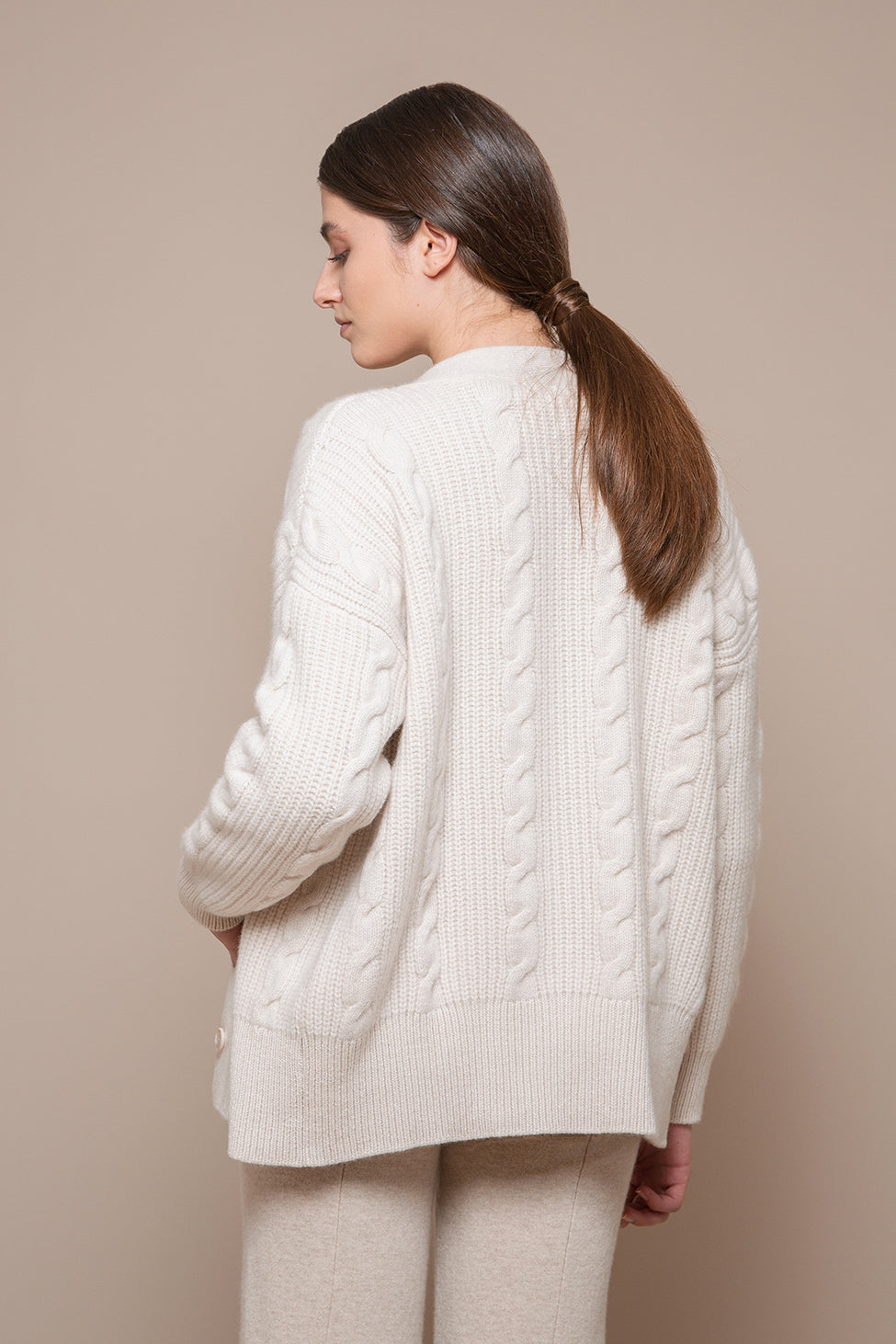 Oversized and chunky cashmere-wool cardigan in a pearl knit that accentuates the natural softness of the yarns chosen to create such a relaxed piece perfect for layering. The cardigan features classic braid details along the torso and sleeves, ribbed trims to finish at the waist and cuffs, and buttons made of corozo to increase the natural raw feel of the cardigan. This is the type of piece you will never want to take off for its comfort and warmth.