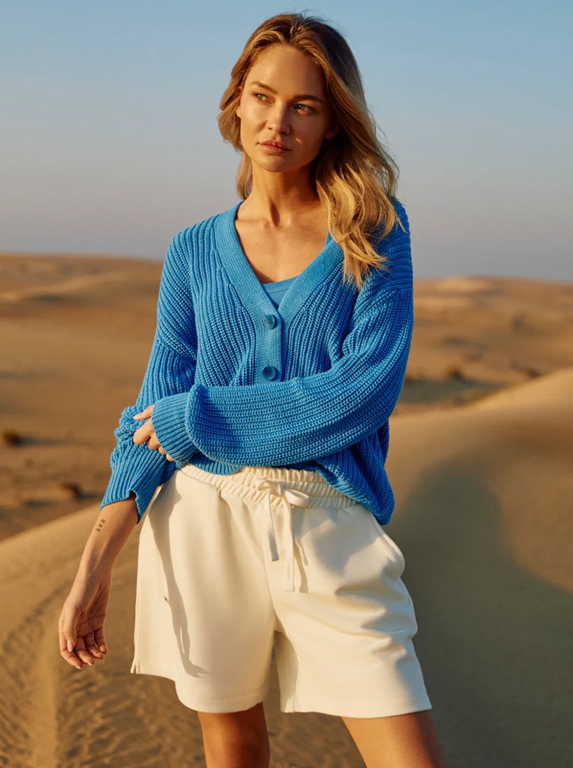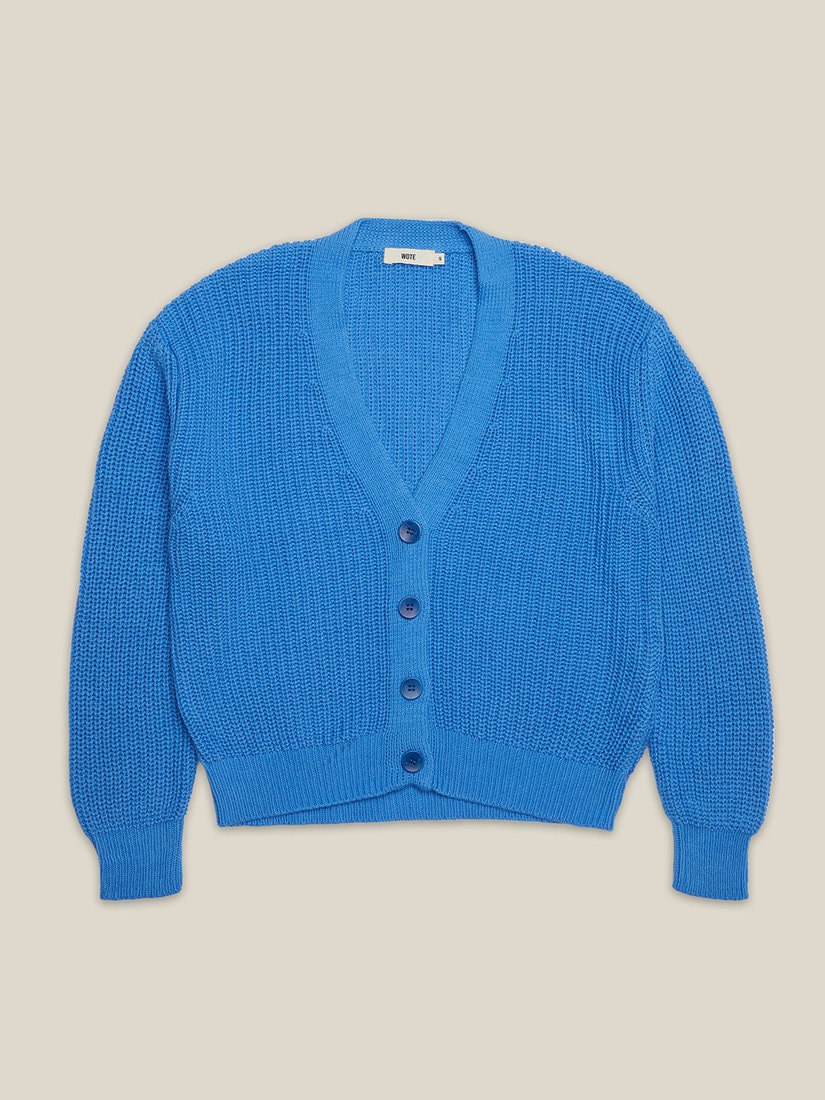 Description: Made from soft and sustainable cotton, our short cardigan is a true favorite. The ribbed structure and the shape lend casualness, no matter how combined. Cosy for home, classy with top or striped shirt---always a favorite look! The special detail are the pretty buttons made of stone nut. We love!