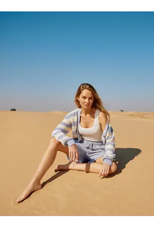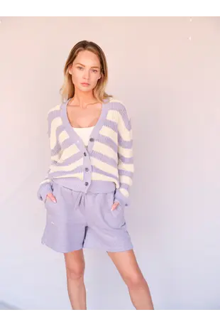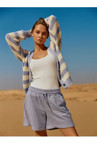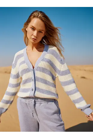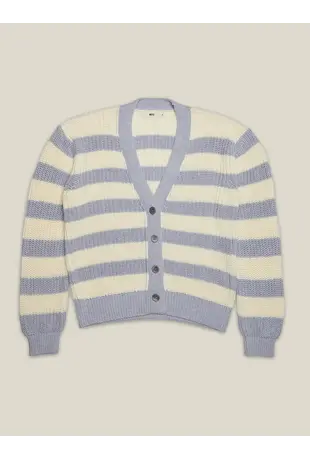 Description: Our short cardigan with block stripes in soft and sustainable cotton is an absolute favorite. The ribbed structure and the shape lend casualness. Absolute favorite look! The special detail are the pretty buttons made of stone nut. Striped love!