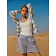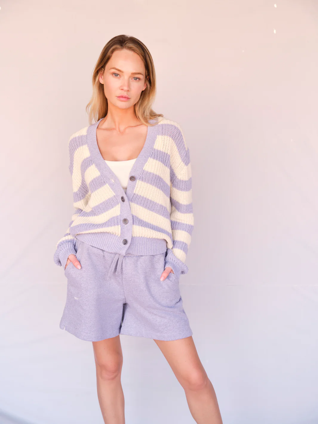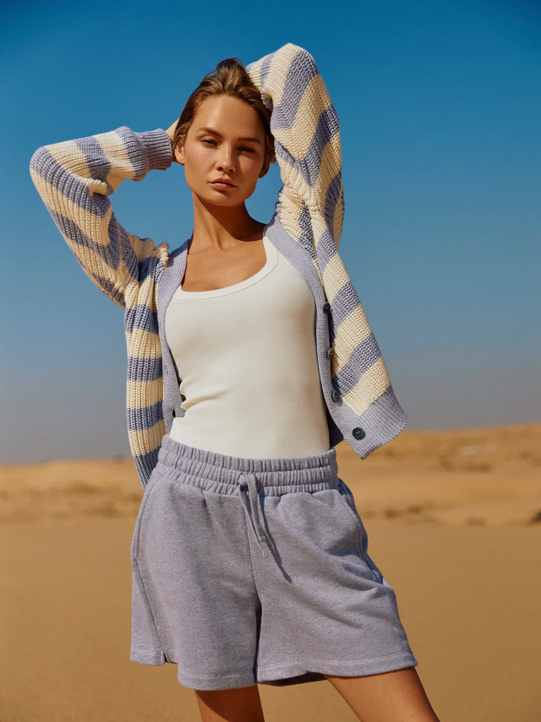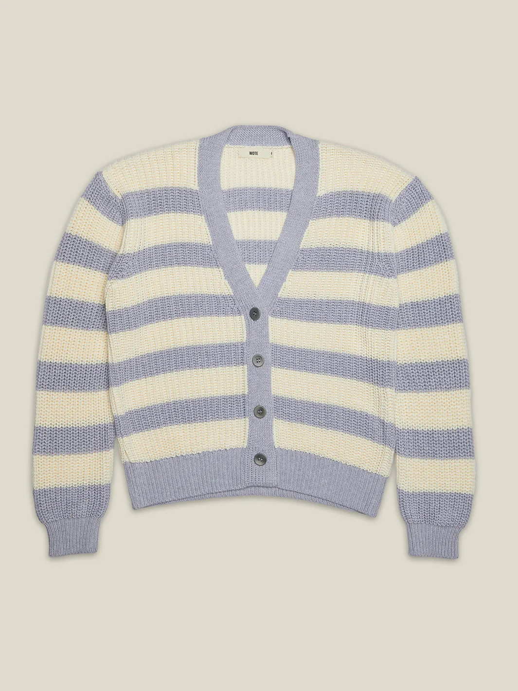 Description: Our short cardigan with block stripes in soft and sustainable cotton is an absolute favorite. The ribbed structure and the shape lend casualness. Absolute favorite look! The special detail are the pretty buttons made of stone nut. Striped love!