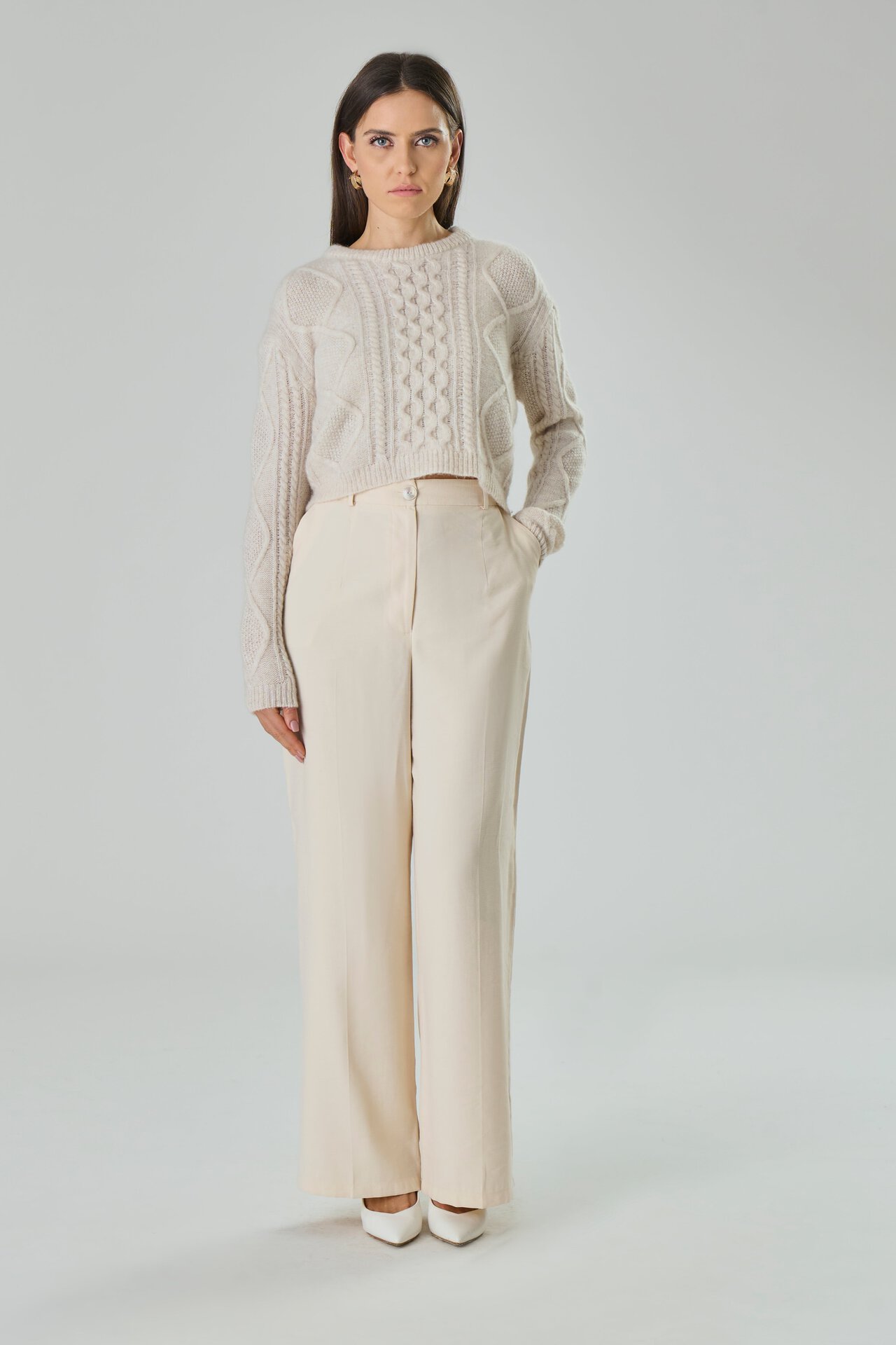 Crew-neck sweater with decorative braids and opening on the back with knitted bow closures.