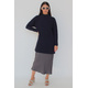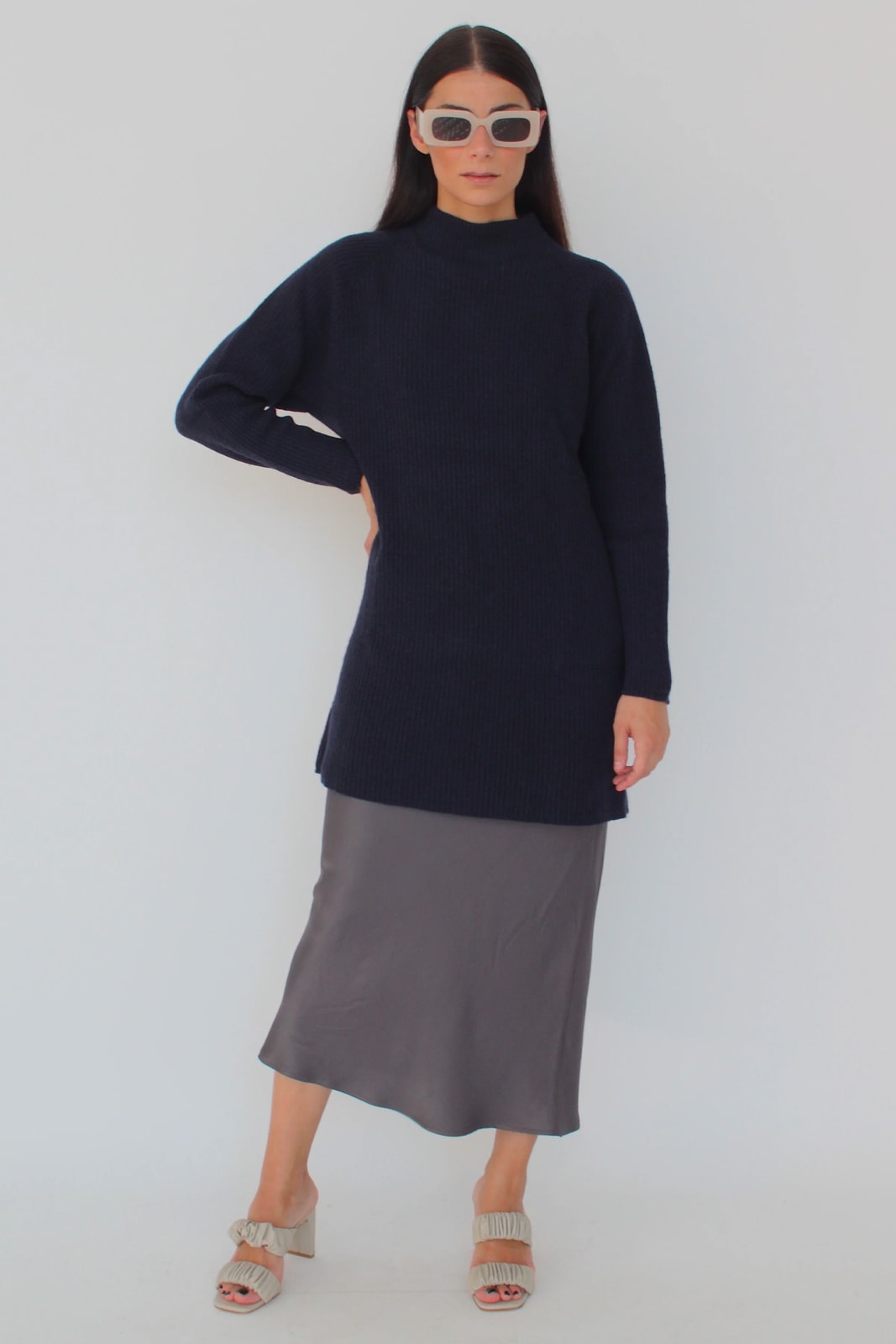 Soft dress with ribbed workmanship, long sleeves, mock neck, straight hem, medium length above the knee.