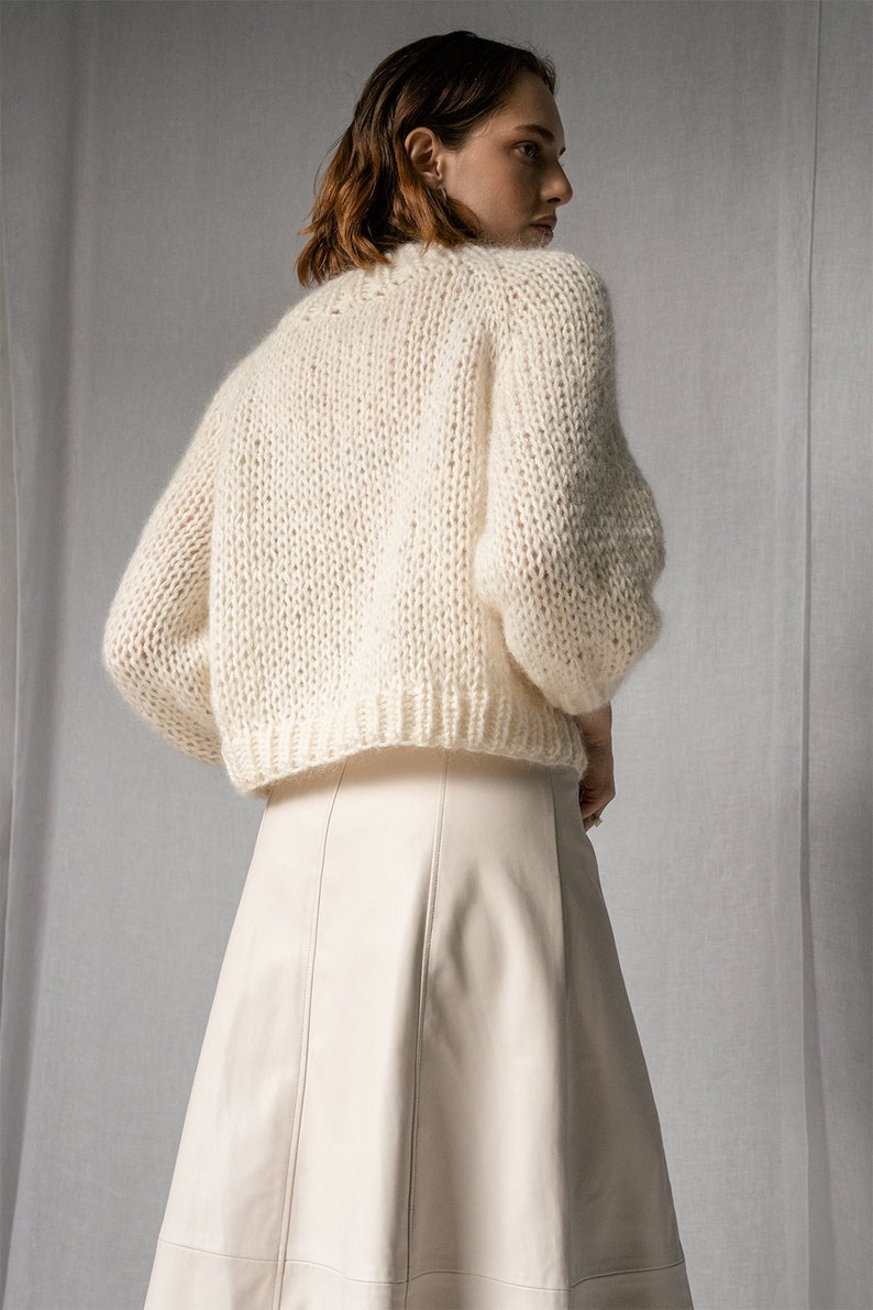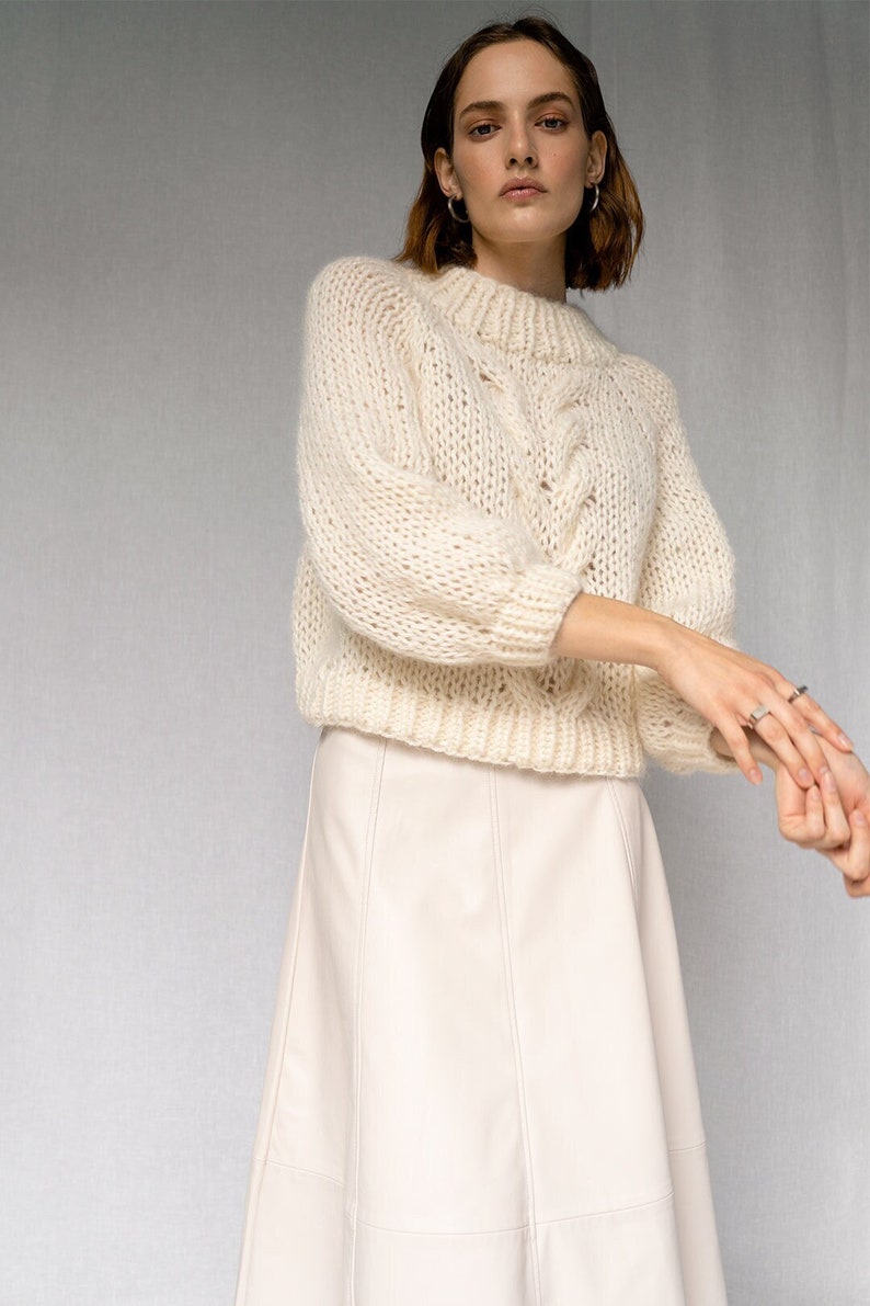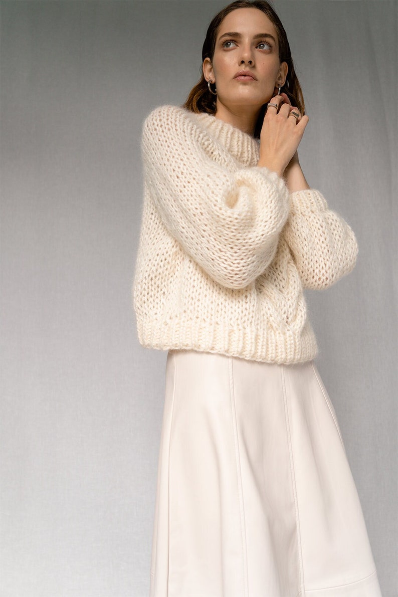 The Chunky Braid Sweater — a chunky yet lightweight raglan sweater featuring a braid cable stitch and an extra chunky ribbed neck. Hand-knit with warm, super soft and luxurious kid mohair that feels like being wrapped inside a squishy, puffy cloud.