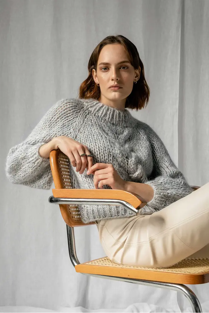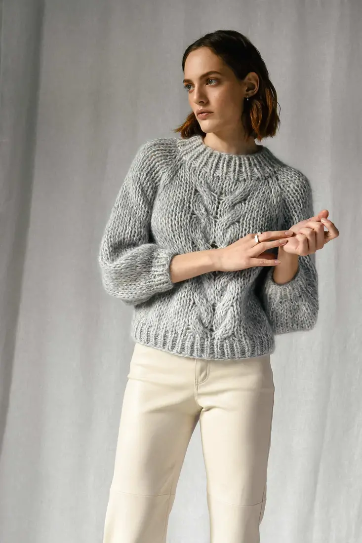 The Chunky Braid Sweater — a chunky yet lightweight raglan sweater featuring a braid cable stitch and an extra chunky ribbed neck. Hand-knit with warm, super soft and luxurious kid mohair that feels like being wrapped inside a squishy, puffy cloud.