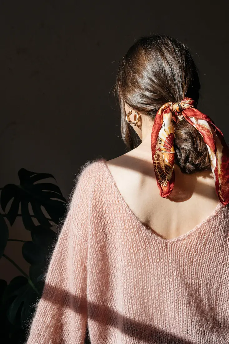 Delicate hand-knit sweater made from super soft and luxurious kid mohair blend. This pullover has two reversible sides, one deep V-neck side, and one boat neck side so you can wear it either way.