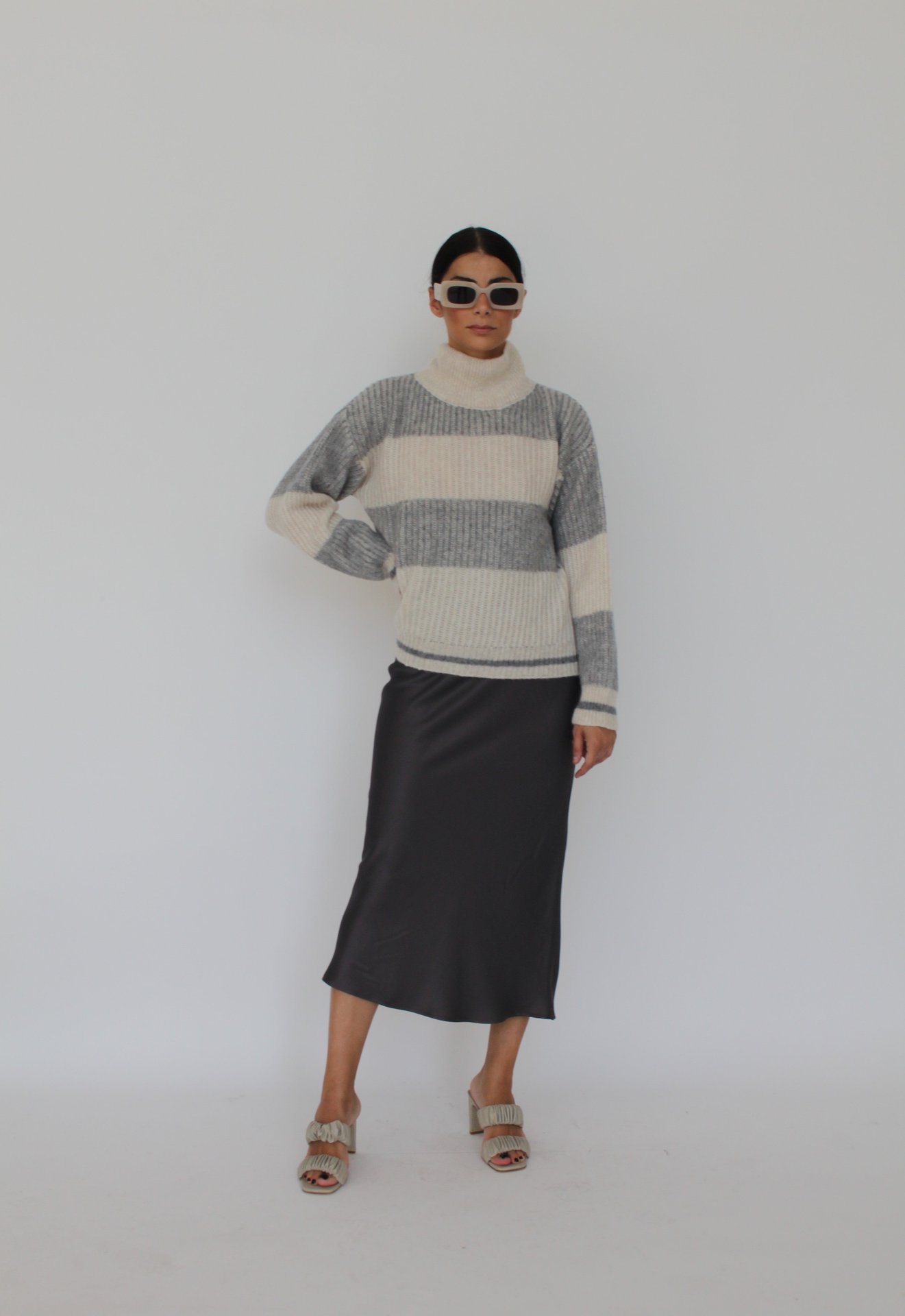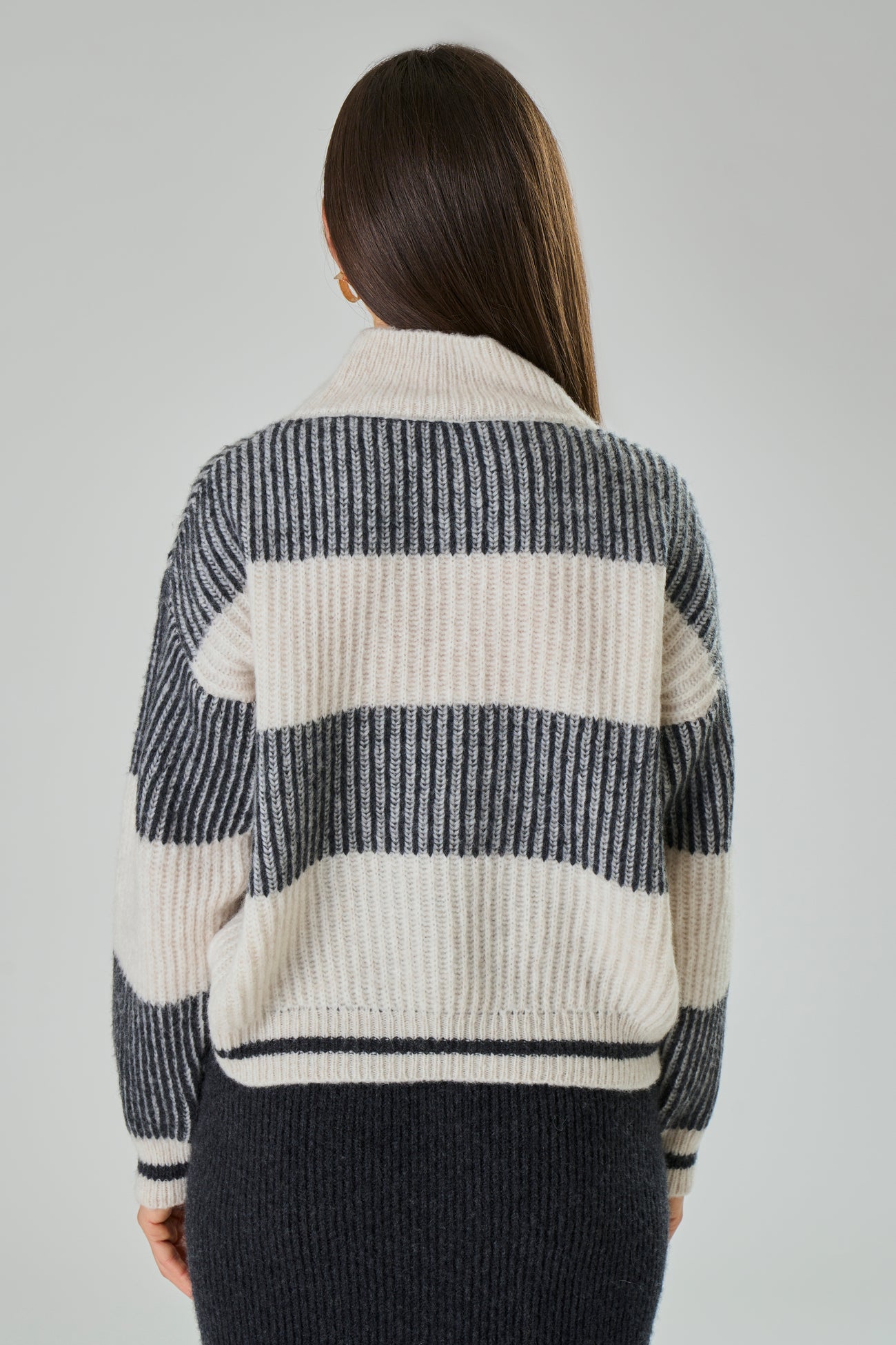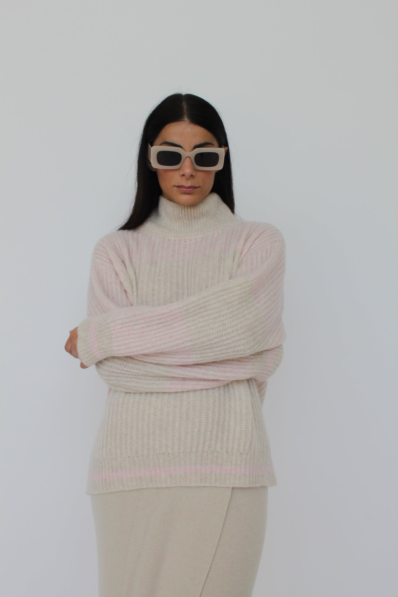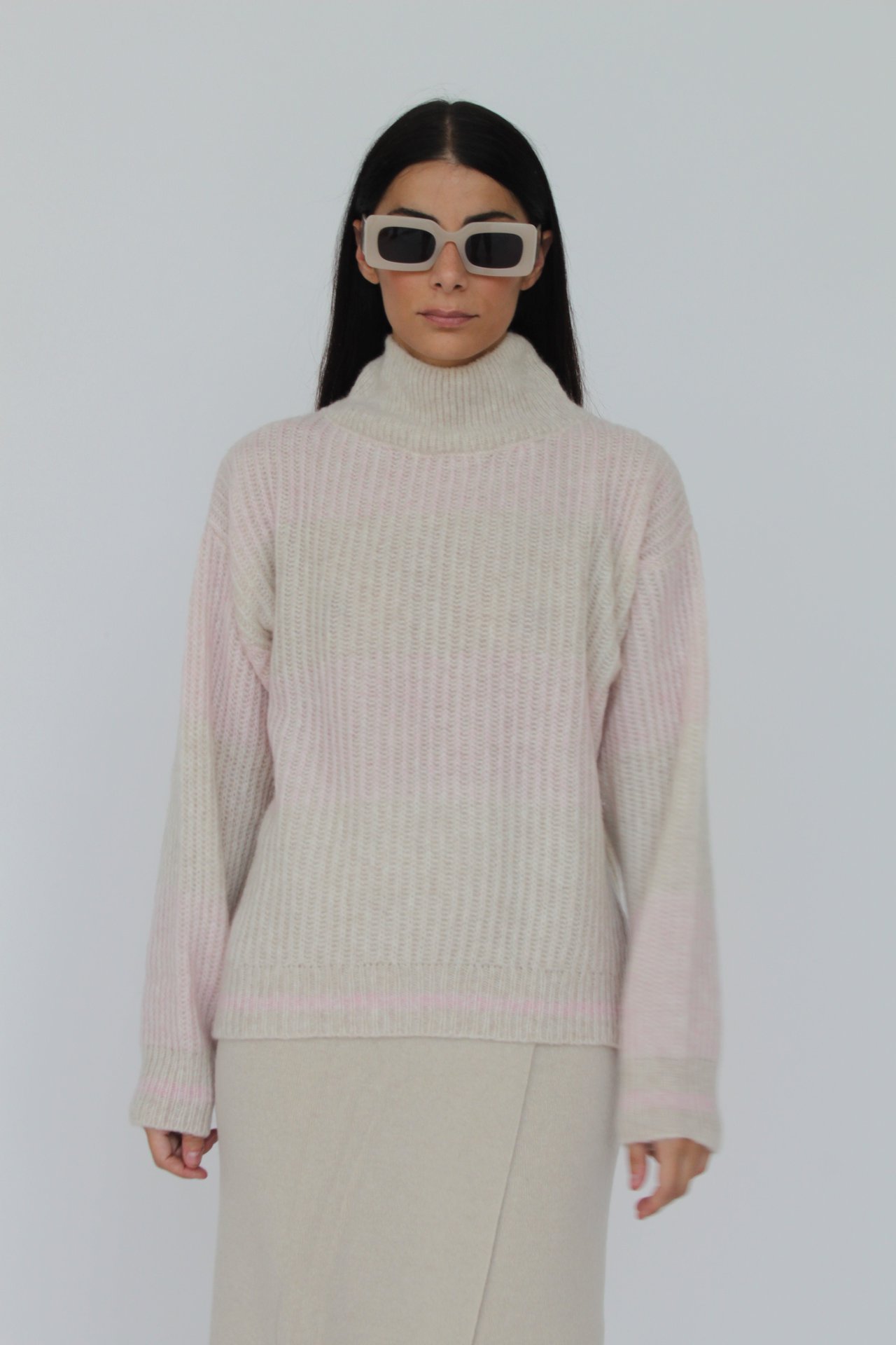 Loose turtleneck sweater with two-tone vanisé banded workmanship with flounce on the bottom and cuffs.