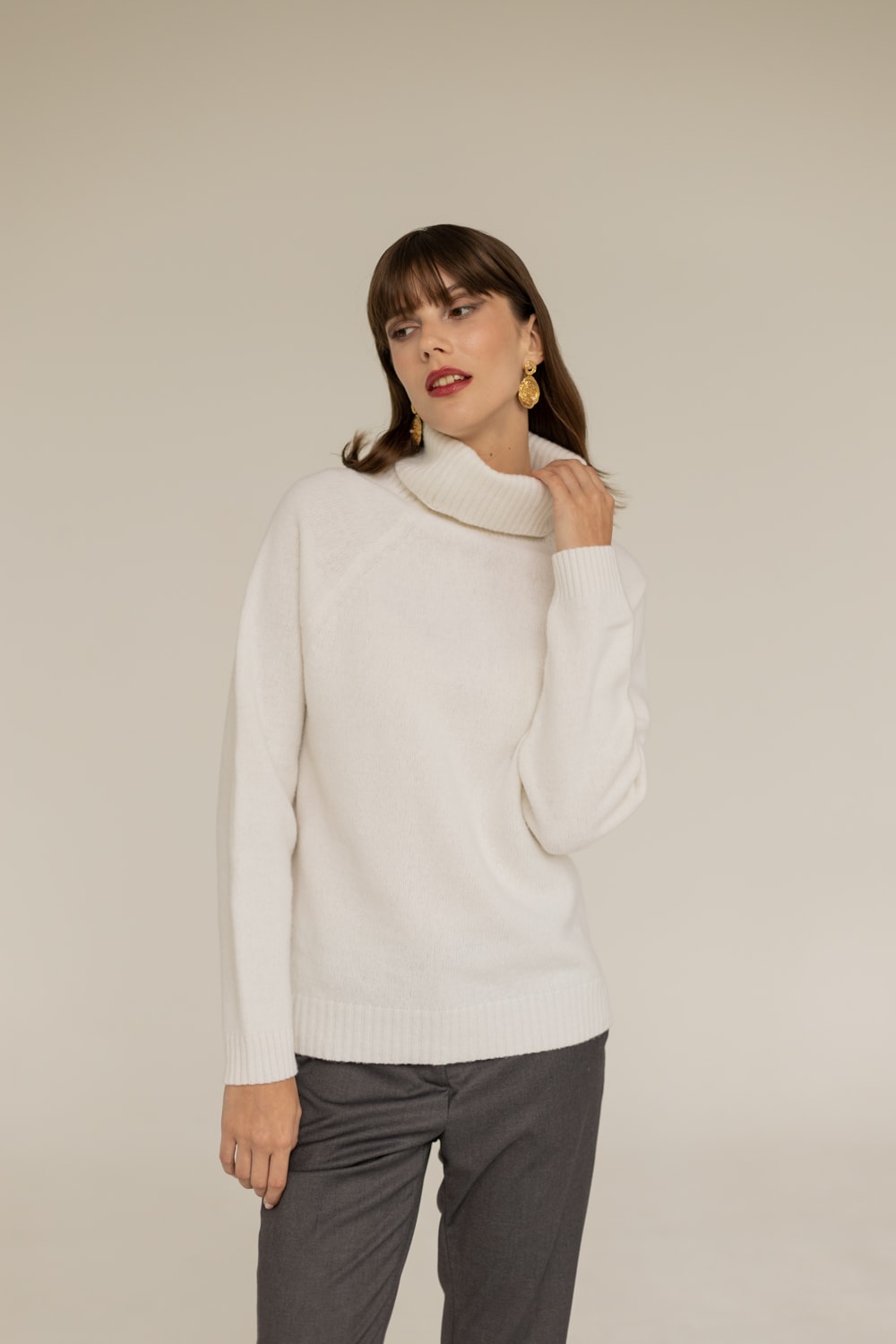 The ecru cashmere turtleneck is a sweater made of extremely soft cashmere yarn and merino wool. The sweater has a classic, timeless cut, is loose and has slightly kimono-like sleeves, with a slightly dropped shoulder, which ensures freedom of movement. The sweater has a large, comfortable turtleneck that fits nicely, covers you on cold days and can be worn with a coat instead of a scarf. The sweater is made of the same yarn as our classic cashmere neck sweaters, only slightly thicker woven.