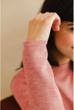 Merino & silk knit sweater with an openwork graphic knit play on the neckline, cuff and hem. The round neck sweater that gives itself a touch of sexyness...